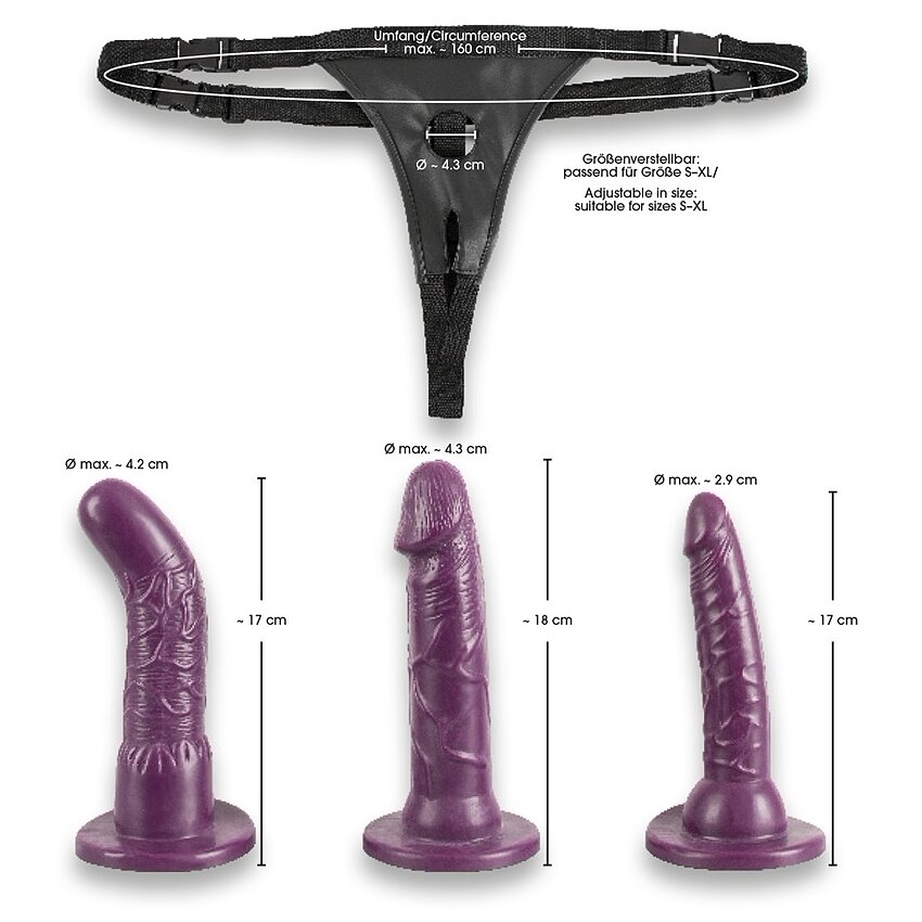 Strap On Bad Kitty Strap on de culoarea mov cu 3 tipuri de dildo din material fin plăcut la atingere. 4 piese mov ce pot să pigmenteze jocurile erotice între bărbați și femei sau doar între femei.