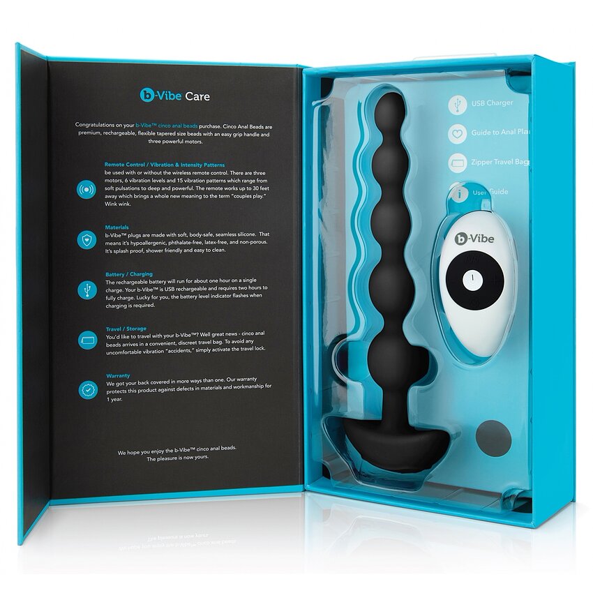 Bilele anale B-Vibe sunt singurele bile premium, controlate prin telecomanda, cu 21 de moduri ale vibratiei si 3 motoare puternice. Poti experimenta cu multitudinea de moduri ale vibratiei prin combinarea celor 6 niveluri de intensitate cu cele 15 moduri ale vibratiei. Dimensiunile bilelor este crescatoare, astfel incat Bilele Anale B-Vibe permit atat incepatorilor, cat si celor experimentati sa se bucure de aceasta jucarie. Designul inovator si tehnologia avansata iti prezinta noi posibilitati de a te bucura de viata sexuala in cuplu. Purtate in timpul actului sexual, aceste bile vor intensifica, fara niciun dubiu, climaxul.