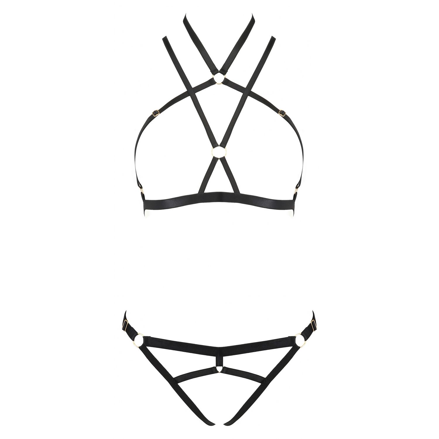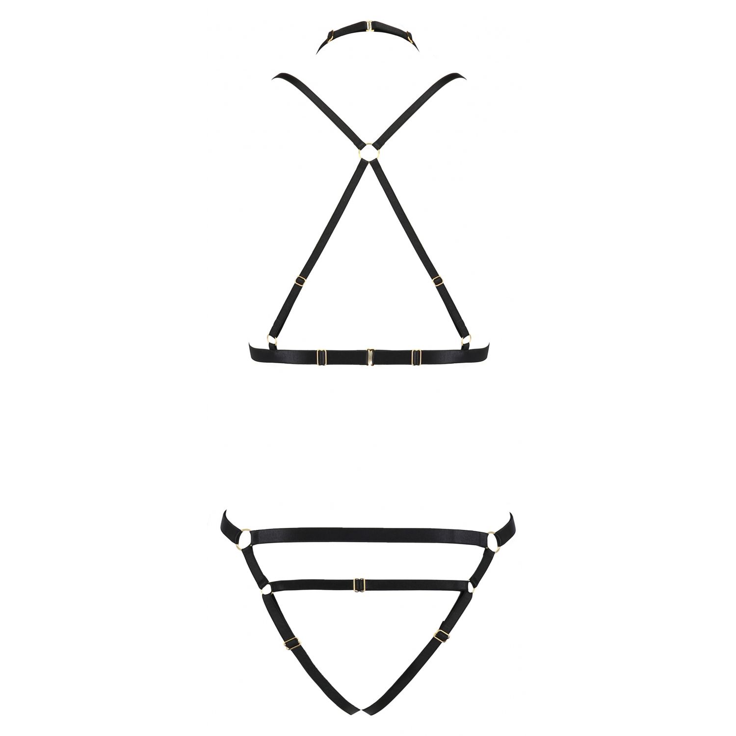 - Setul include un ham decorativ care poate fi purtat pe coapse și talie, subliniind silueta. - Designul stimulativ al sutienului deschis este completat de legături metalice. - Breteluțele sunt moi și elastice, asigurând un confort sporit. - Chilot cu ață are o croială în configurație de romb în față și un decupare îndrăzneț în spate. - Breteluțele sunt ajustabile pentru o potrivire perfectă. - Setul emană o atmosferă de bondage fierbinte, fiind atât elegant cât și obraznic.