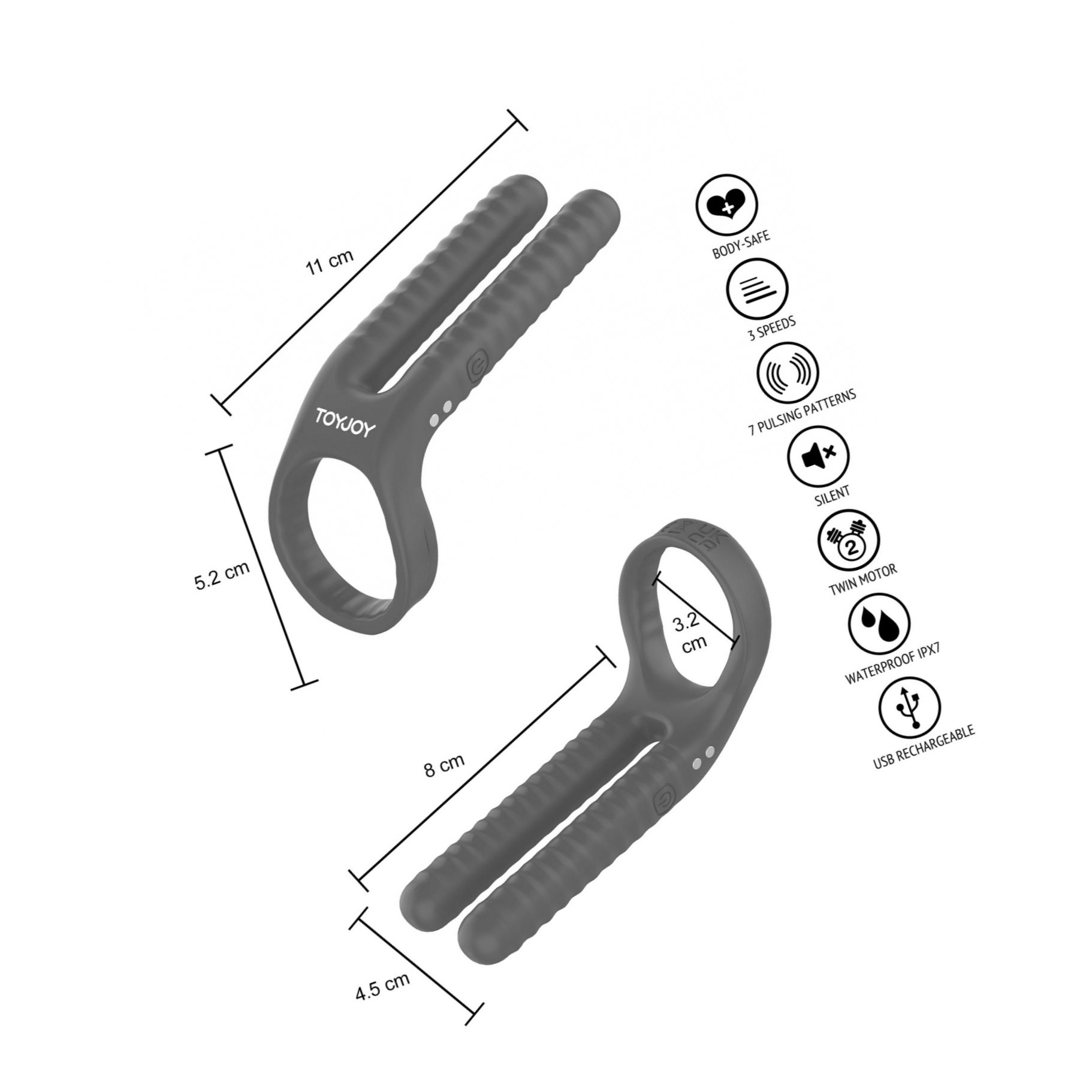 Inelul vibrator are 2 motoare de putere, extrem silențioase, și este însușit cu 7 aplicații de vibrații și 2 trepte de viteză. Stimulatorul pentru clitoris este realizat din încrețituri de silicon medicinal care intensifică plăcerea. Extensia inelului este suficient de îndelungă pentru a penetra complet și pentru a atinge punctul G. Cu funcția de alimentare USB, acest Inel vibrator pentru cupluri poate fi încărcat direct de pe laptop sau computer. Momentul de așteptare pentru o alimentare este scurt, aproximativ 2 ore. De asemenea, inelul are o autonomie de 60 de minute, timp în care vă puteți bucura de funcțiile de stimulare. Inelul este realizat din silicon medical hipoalergenic, flexibil, ce se adaptează deplin dimensiunilor penisului dumneavoastră. Este viguros la apă, cu un înalt grad de impermeabilitate, IPX7, ceea ce înseamnă că îl puteți utiliza inclusiv în cadă sau în duș. Nu conține chimicale periculoase (toxină ce poate produce infertilitate) sau alte elemente care să vă afecteze sănătatea.