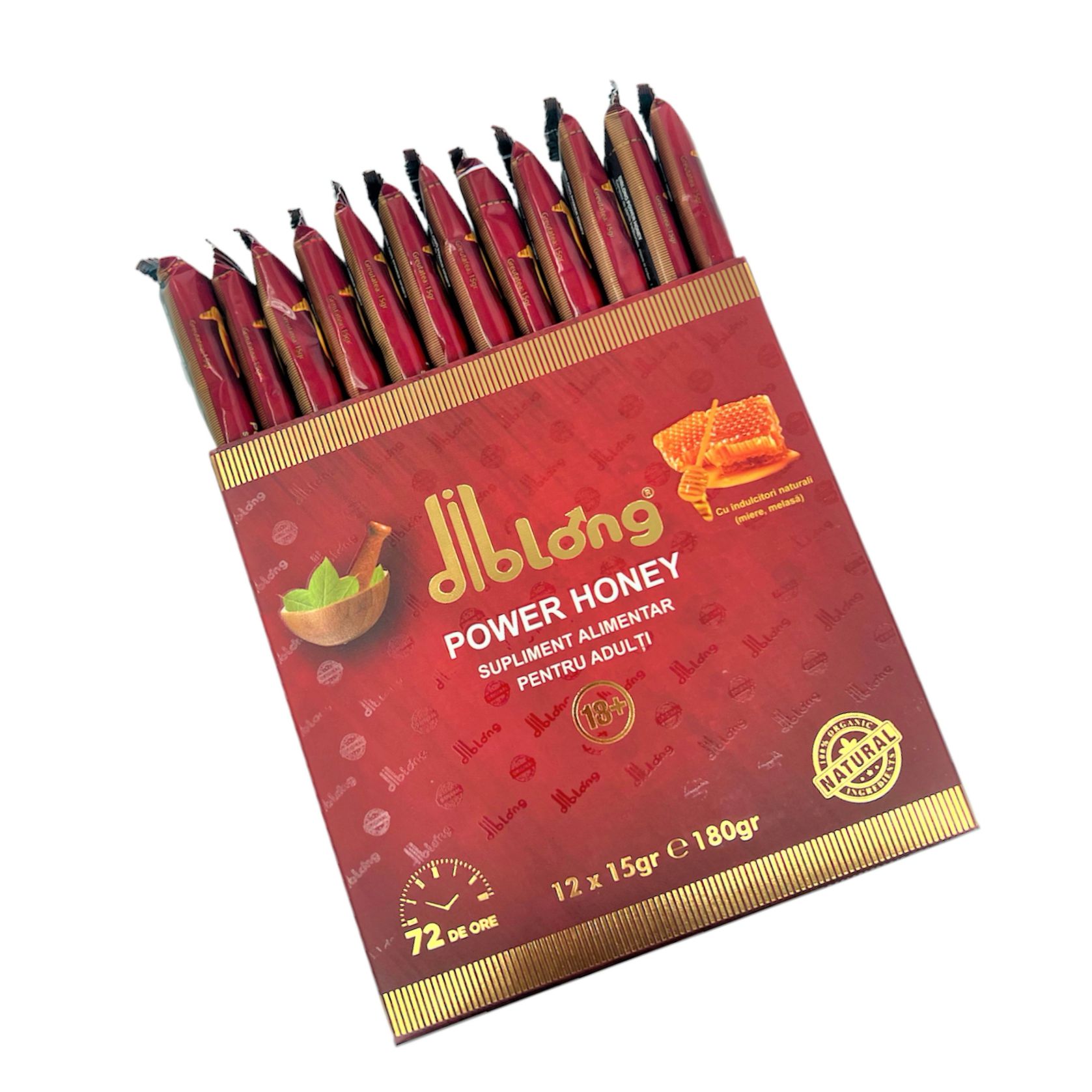 Ingrediente: extract de miere polifloră, melasă de dud alb și negru, polen, coriandru, lepidium/macă, nalbă-de-pădure, fenicul, carob, ovăz, ghimbir, cuișoare, ginseng-roșu-corean, galangal, ginseng-american, rodie, scorțișoară, ginkgo biloba, arbore-de-cola, sunătoare, extract de macă, lăptișor de matcă, palmier-pitic, rădăcină de sparanghel. Mod de administrare: Mierea afrodisiacă Diblong este un produs concentrat, de aceea vă recomandăm să începeți întotdeauna cu o jumătate de plic cu aproape 30 de minute înainte de începerea momentului sexual. Consumați încă o jumătate de plic doar dacă observați într-un interval de câteva ore că doriți un efect mai voinic decât cel inițial.