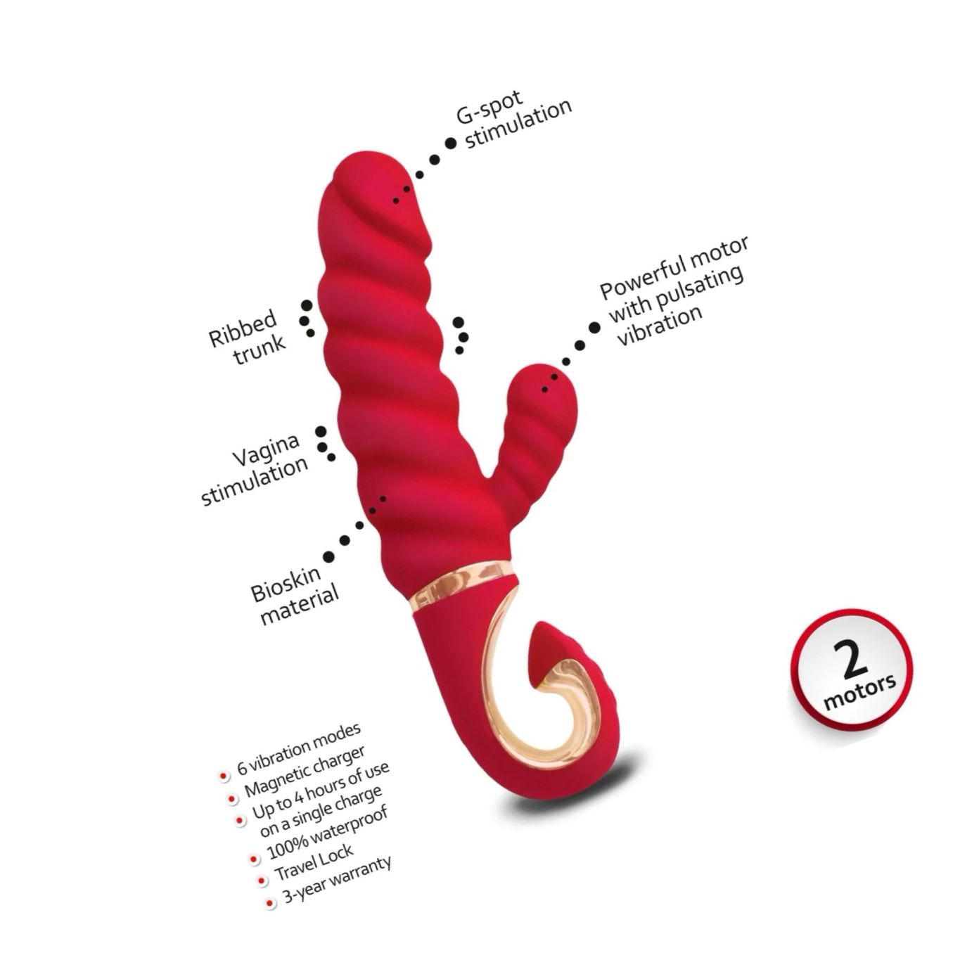 -până la 4 ore de funcționare cu o încărcare completă a bateriei -încărcător magnetic. Vă rugăm să rețineți că timpul inițial de încărcare este de 2 ore -blocare călătorie: pentru a debloca apăsați butonul + și mențineți apăsat timp de două secunde -stimularea simultană a trei zone cele mai sensibile: punctul G, clitorisul și deschiderea vaginală -design ergonomic -2 motoare pătrunzătoare și silențioase -6 noi feluri de vibrație cu intensitate variabilă - de la tremurături luminoase la vibrații intense -control intuitiv -fabricat din silicon clinic hipoalergenic de înaltă calitate -fără miros. Pentru a încerca senzatii mai tari si o alunecare mai fina ar fi buna achizitionarea unui lubrifiant. Spalati produsul Vibrator Gvibe Gcandy Mini Chili Corai premergator întrebuințării cu o solutie speciala de igiena pentru astfel de produse.
