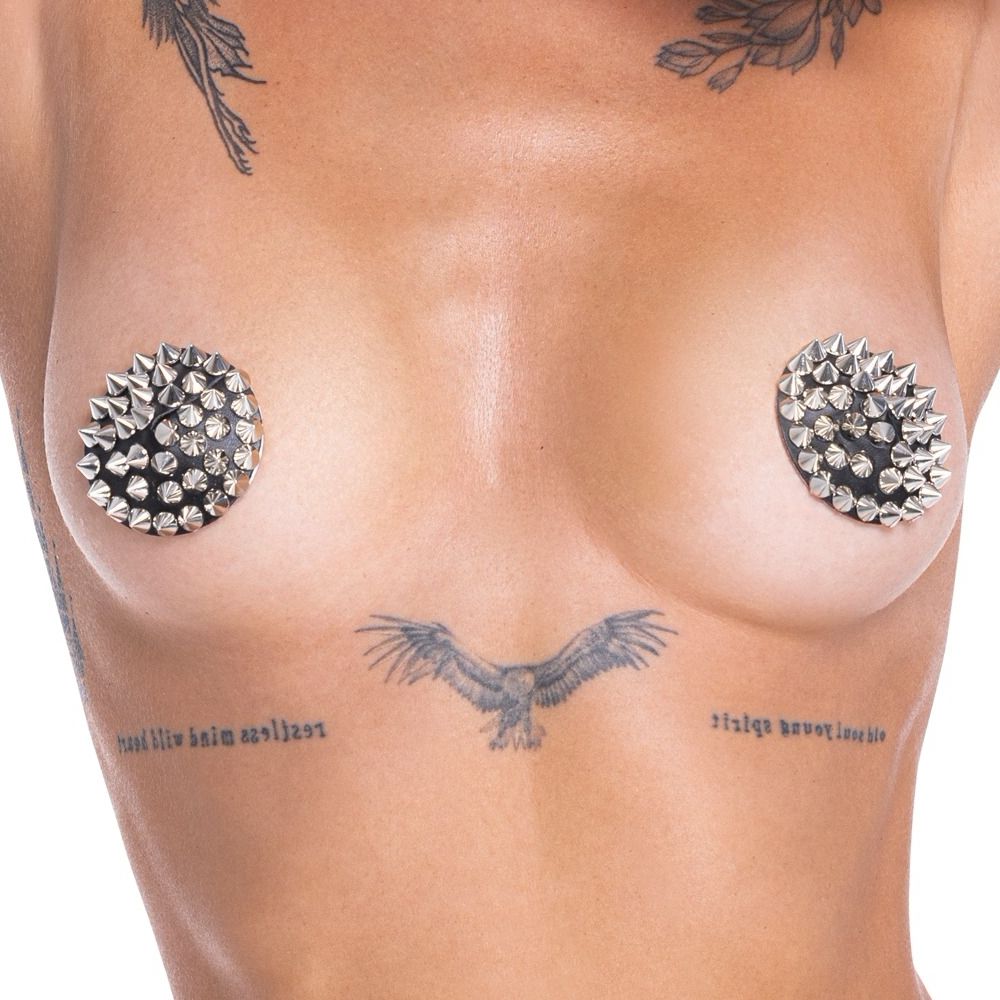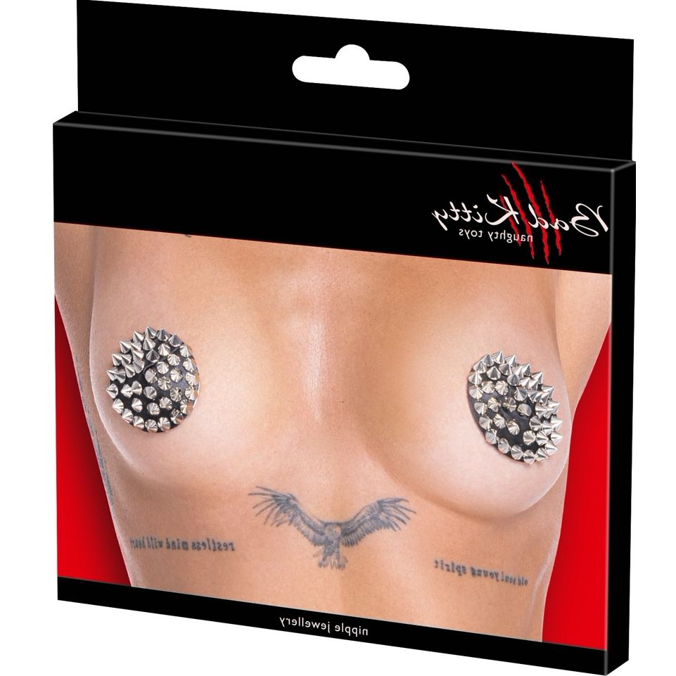 Stickeri rotunzi pentru mamelon de la Bad Kitty sunt confecționați din imitație de piele neagră elegantă, împodobiți cu decorațiuni în formă de țepi. Aceste podoabe sunt lezne de aplicat și pot fi reutilizate, cu condiția să se reaplice folia protectoare înainte de depozitare. Fiecare sticker măsoară 7 cm și cântărește 18 g, fiind conceput din EVA, ABS, metal și adeziv cordial cu pielea.