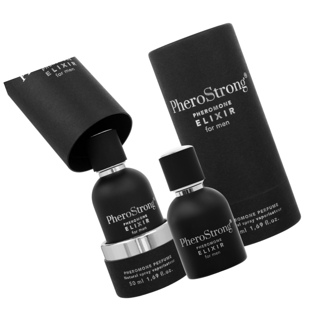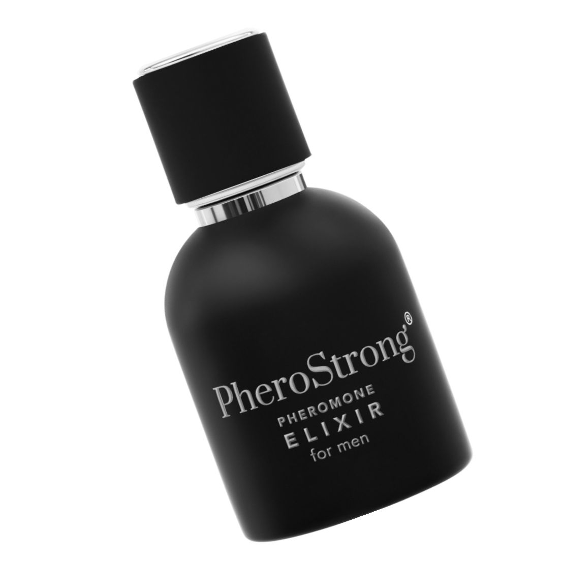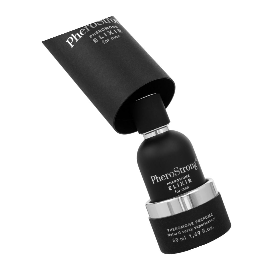 PheroStrong Elixir Feromoni 50 ml: parfum premium cu note de ylang-ylang, bergamot, heliotrop, hedione și trandafir bulgăresc; bază de smirnă și lemn de santal. Flacon compact pentru transport discret. Aplicare pe încheieturi, gât sau după urechi. Uz extern. Evitați contactul cu ochii.