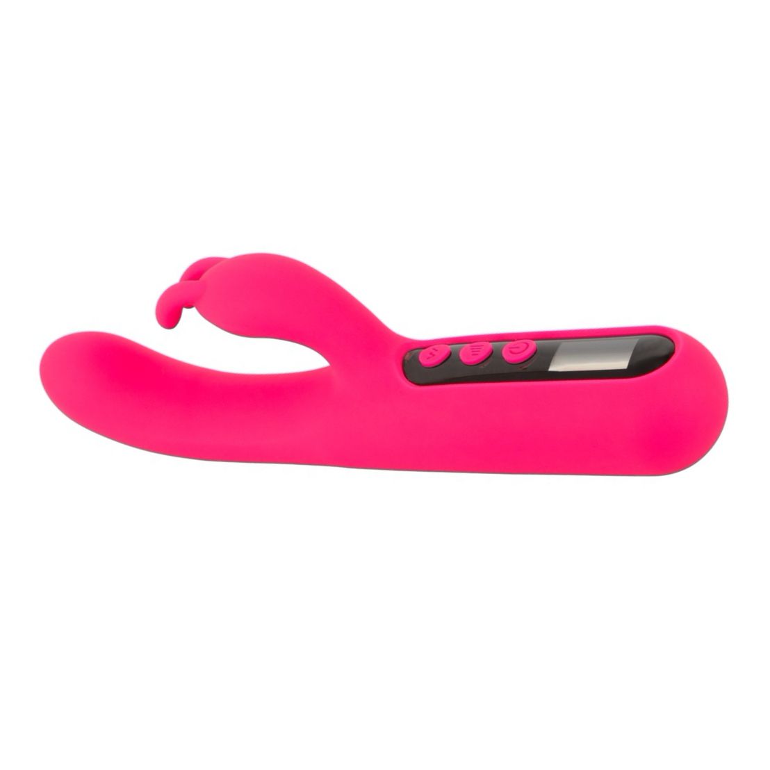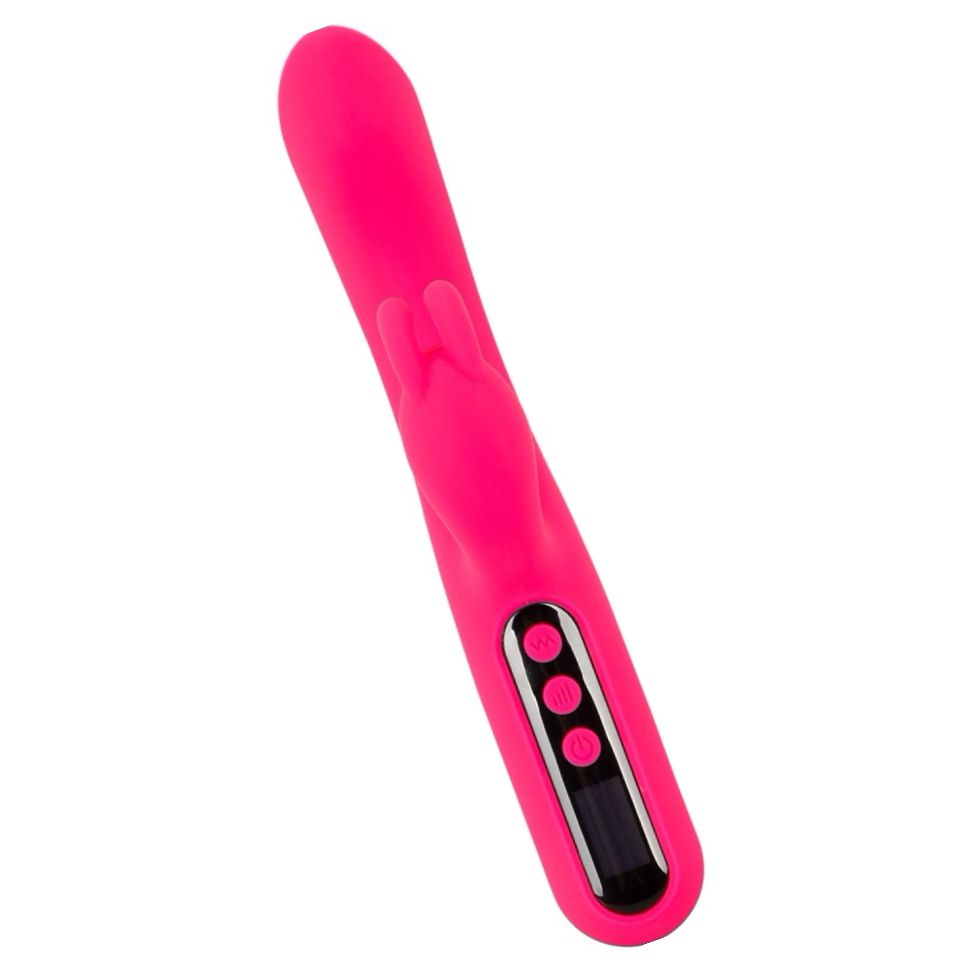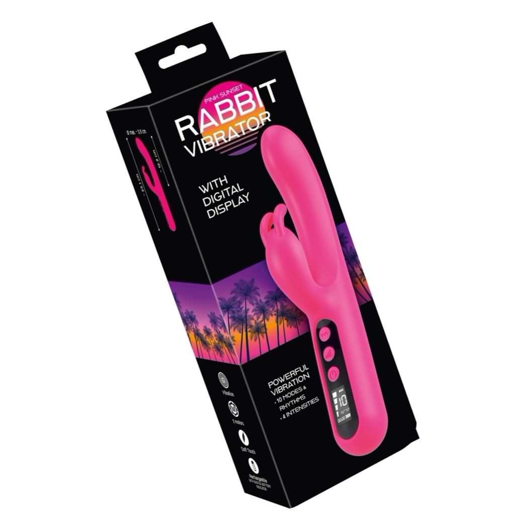 Vibrator iepure Pink Sunset de la You2Toys: control digital cu display, 10 feluri de vibrație, 4 intensități, 2 motoare, cu acumulator USB și robust la apă. Design ergonomic din silicon Soft Touch pentru inserție confortabilă.
