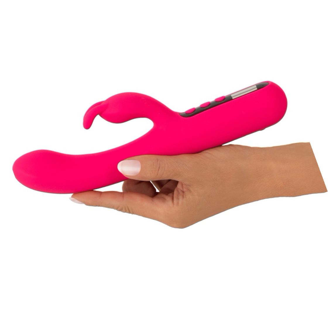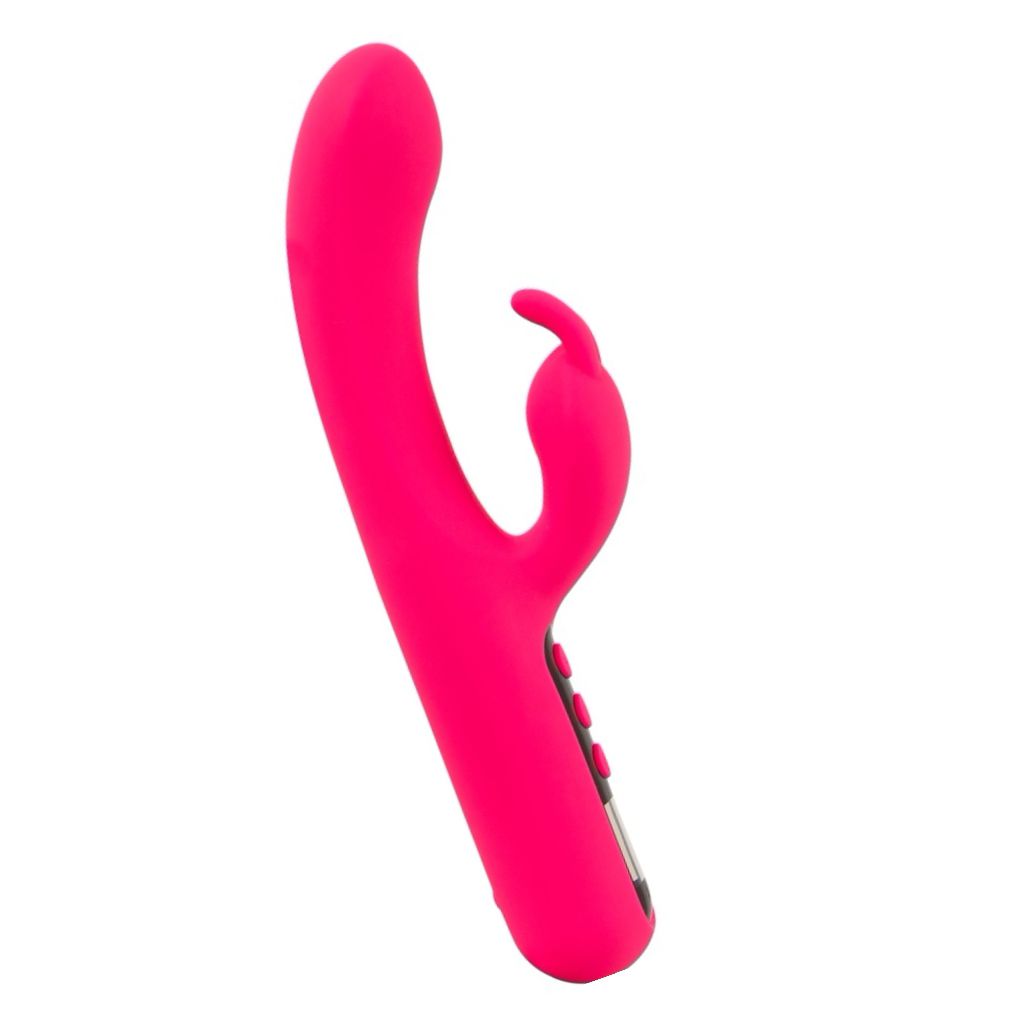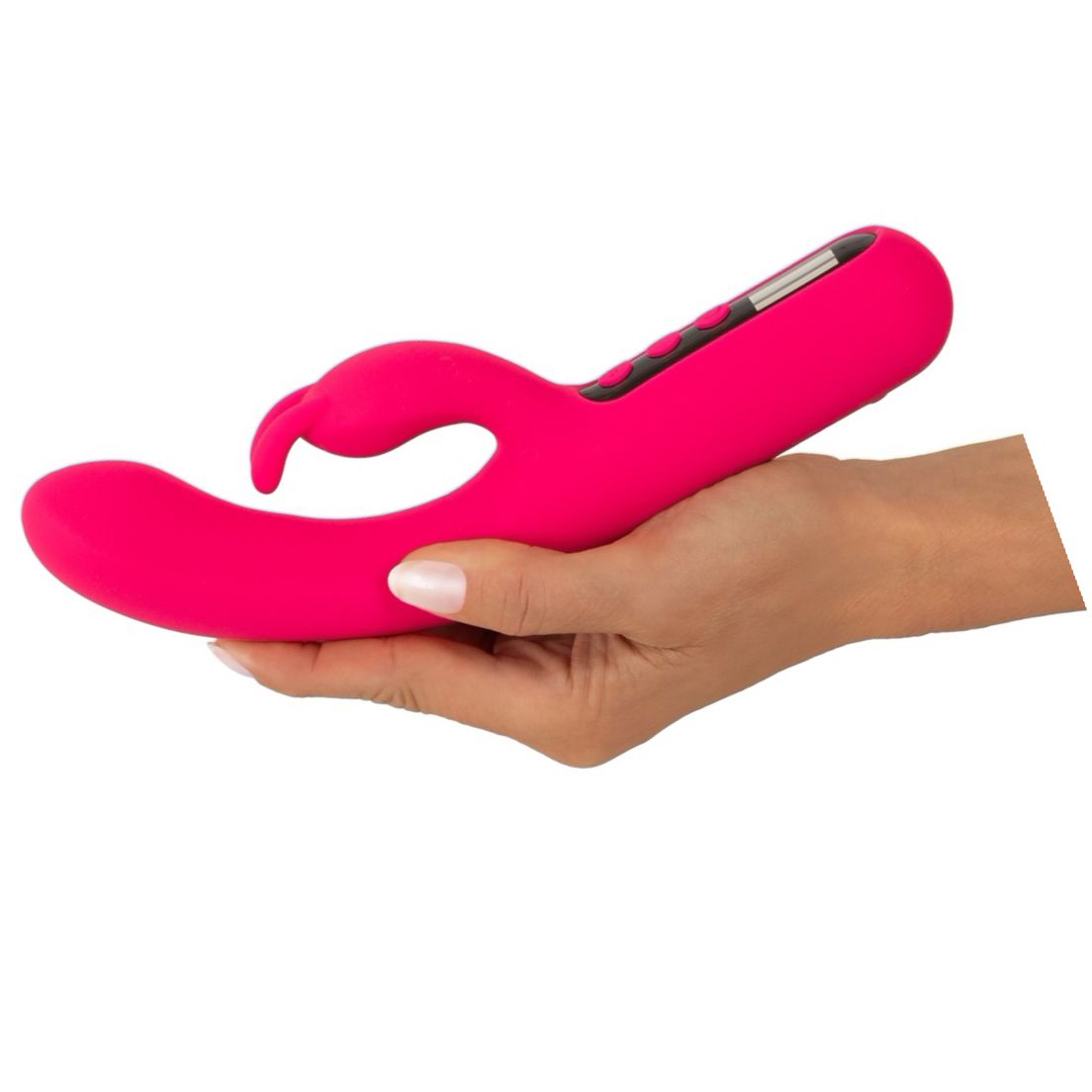 Vibrator iepure Pink Sunset de la You2Toys: control digital cu display, 10 feluri de vibrație, 4 intensități, 2 motoare, cu acumulator USB și robust la apă. Design ergonomic din silicon Soft Touch pentru inserție confortabilă.