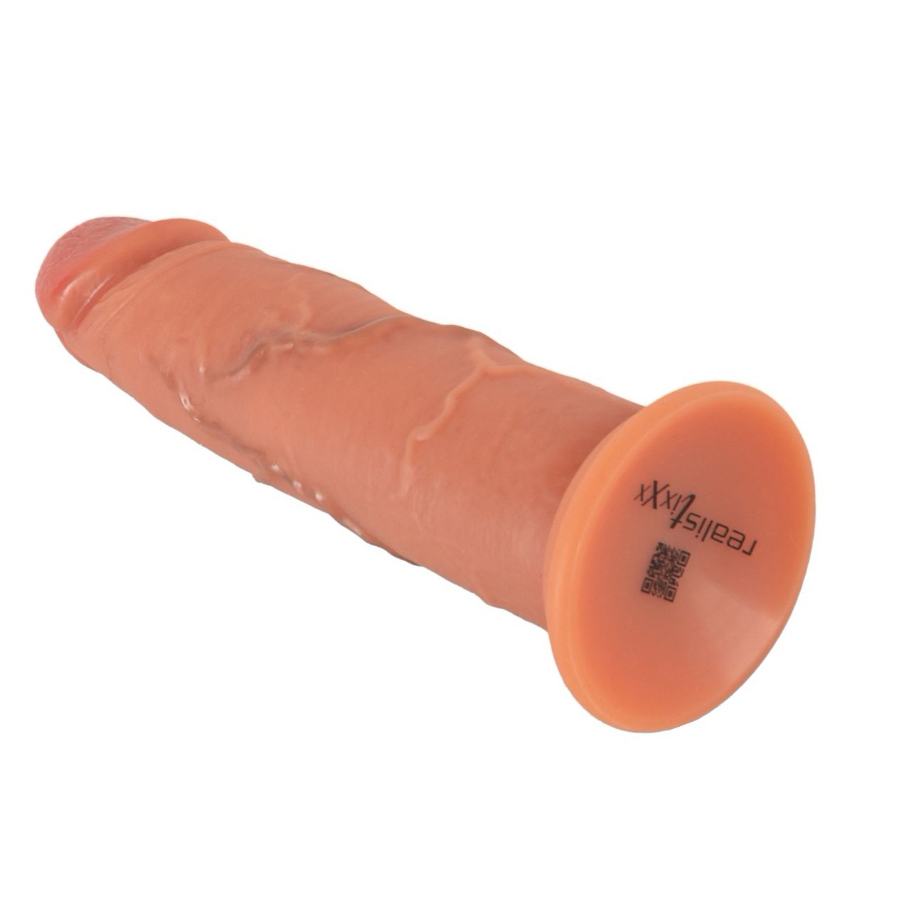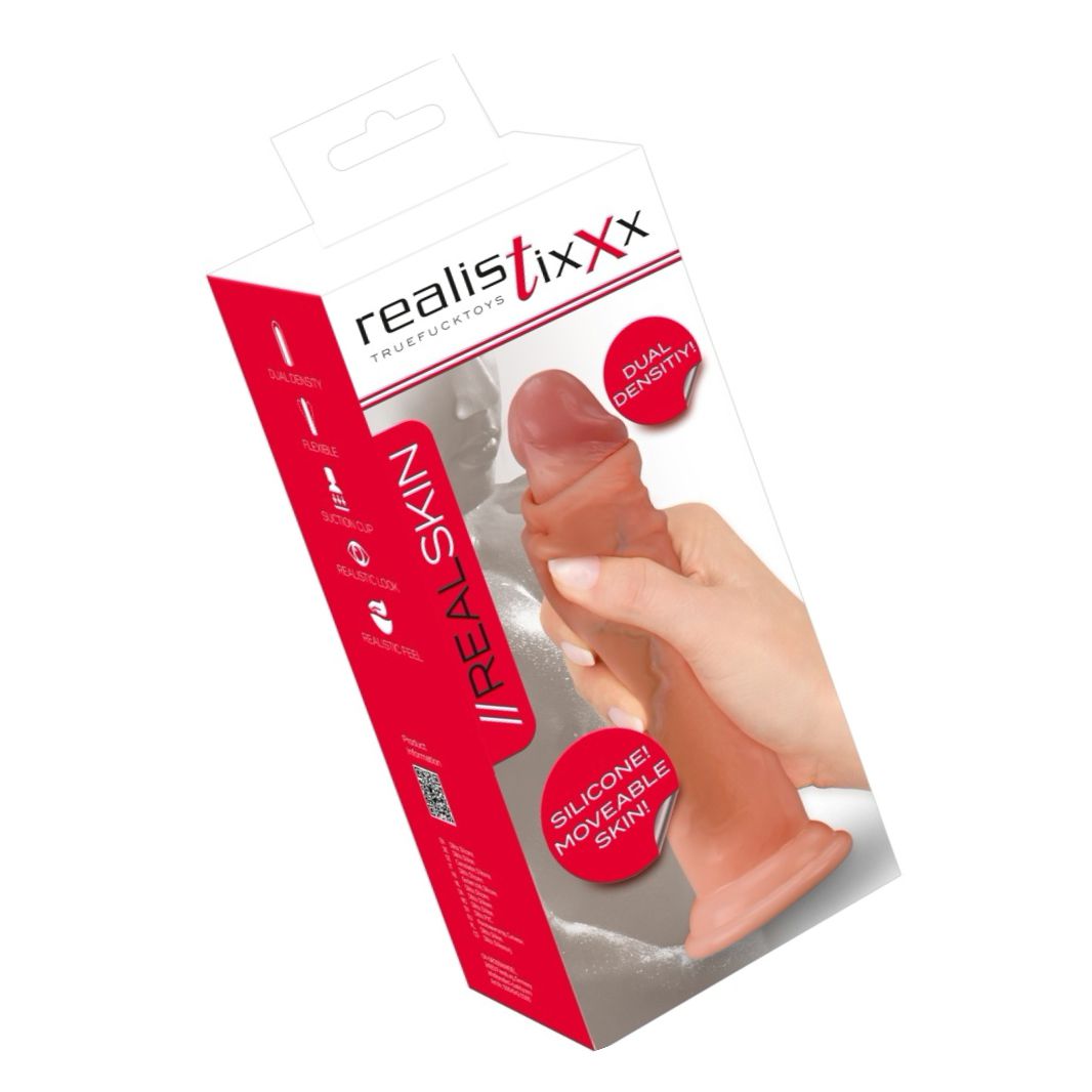 Realistixxx Real Skin: dildo din silicon cu densitate duală și suprafață mobilă pentru senzație naturală. Ventuză intensă pentru utilizare hands‑free; corespunzător cu hamuri. Extindere totală 20.5 cm, inserabilă 18.5 cm, diametru 4.8 cm. Sigur și discret.