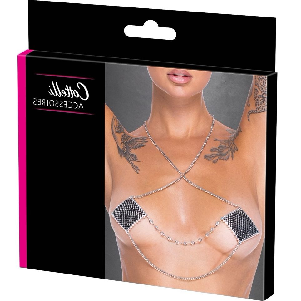 Stickere pentru sâni, pătrate 5,5×5,5 cm, finisaj argintiu cu cristale negre. Două lanțuri pendulare și un lanț central, unul decorat cu rhinestones. Adeziv bio-prietenos, reutilizabile cu film protector. Sigur, discret și lezne — greutate radicală 54 g.