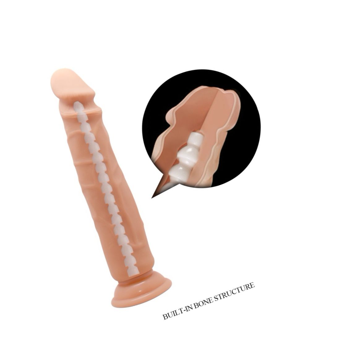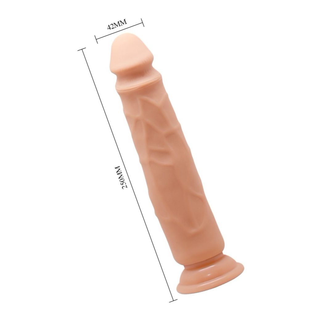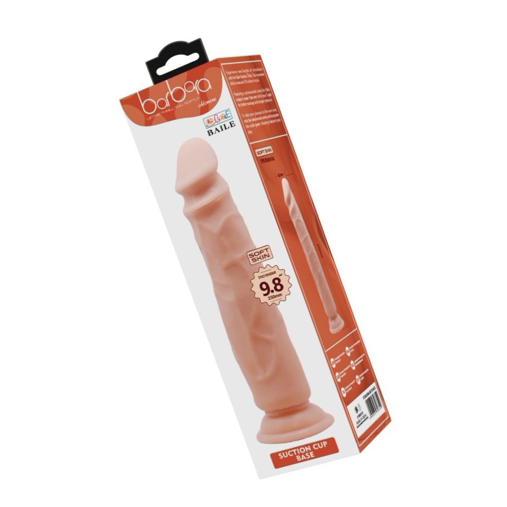 Penis artificial Baile de 23,5 cm, cu înfățișare realistă, cap pronunțat și textură cu vene. Cupă de aspirație intensă pentru stabilire pe suprafețe plane. Fără vibrații, flexibil, ușor de curățat. Recomandat cu lubrifiant pe bază de apă.