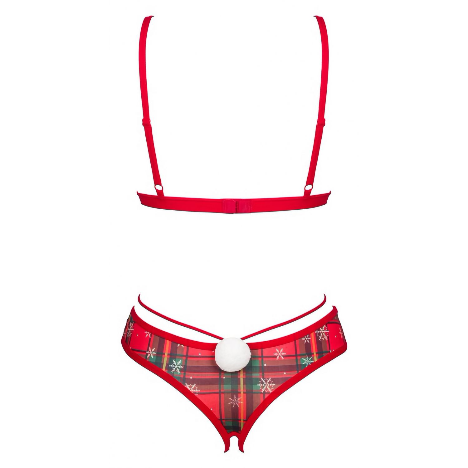 Set Ms. Merrilo de la Obsessive: sutien lipsit de armătură și chilot decupat, din tulle extensibil cu tip în carouri și fulgi albi. Bretele reglabile, pandantiv aurit și pompon pufos la spate. Confort moale și potrivire elastică.