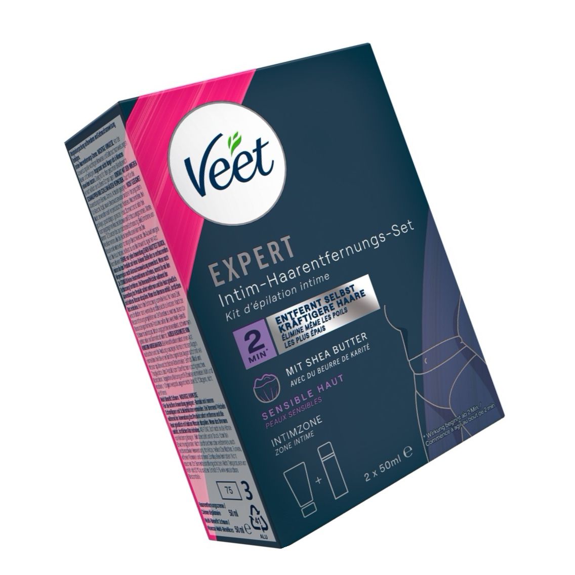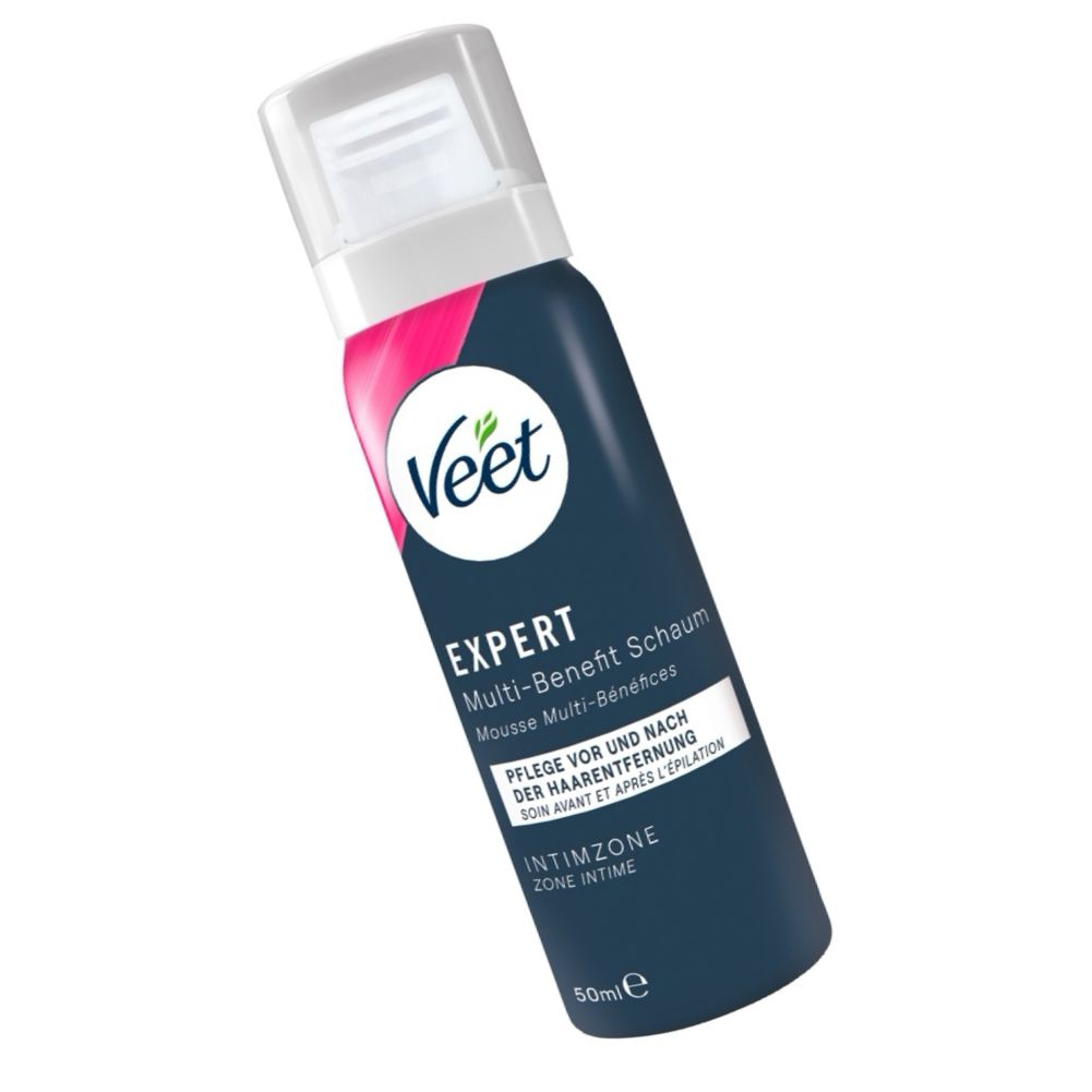 Set Veet EXPERT pentru zona intimă: alifie depilatoare 50 ml (spatulă inclusă) și spumă multifuncțională 50 ml. Îndepărtează firele groase în circa 2 minute, hidratează până la 48 ore și calmează pielea sensibilă.