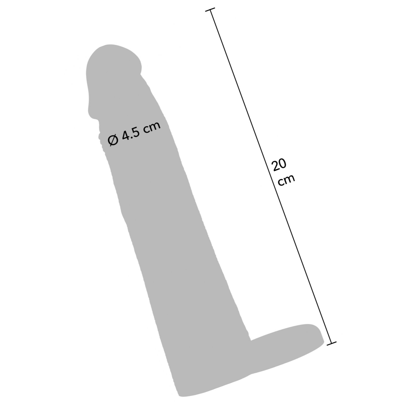 Manșon extensie din silicon lichid, 20 cm, texturat cu vene și cap pronunțat. Inserabil 18 cm, diametru 3.5 cm, inel integrat de 4 cm pentru stabilitate și ventuză pentru fixare. Material sigur pentru corp, textură neted și realistică — pentru volum și susținere.