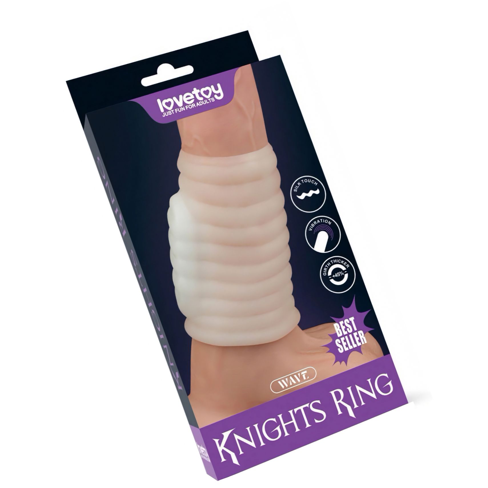 Inel vibrator Lovetoy Knights Ring (alb), TPE. Creşte circumferinţa cu 45%, mărime 10 cm, diametre 3.7/4.8 cm. Robust la apă, fără latex şi ftalaţi. Baterie CR2032 inclusă. Elastic, reutilizabil şi uşor de curăţat.