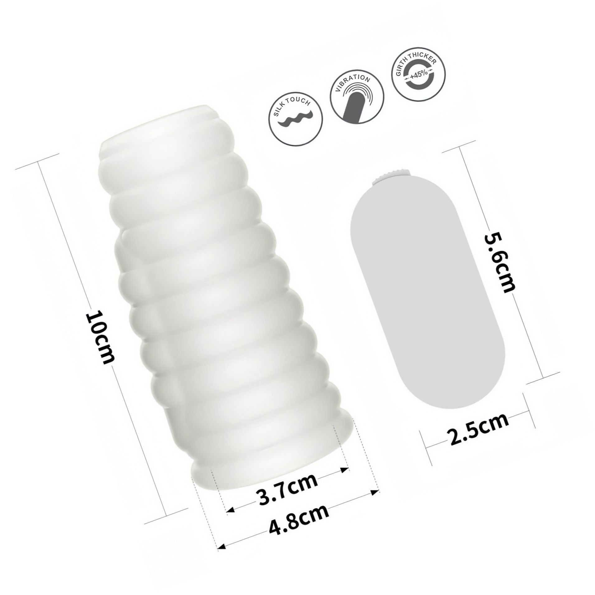 Caracteristici şi beneficii: - Creşte circumferinţa cu 45% pentru o senzaţie mai plină - Vibraţii pentru stimulare comună, cu control simplu - Material TPE, excluzând cauciuc şi lipsit de ftalaţi, sigur pentru corp - Rezistent la apă, uşor de curăţat şi reutilizabil - Elastic, viguros la rupere şi adaptabil formelor anatomice - Conține 1 baterie CR2032 pentru funcţionare imediată