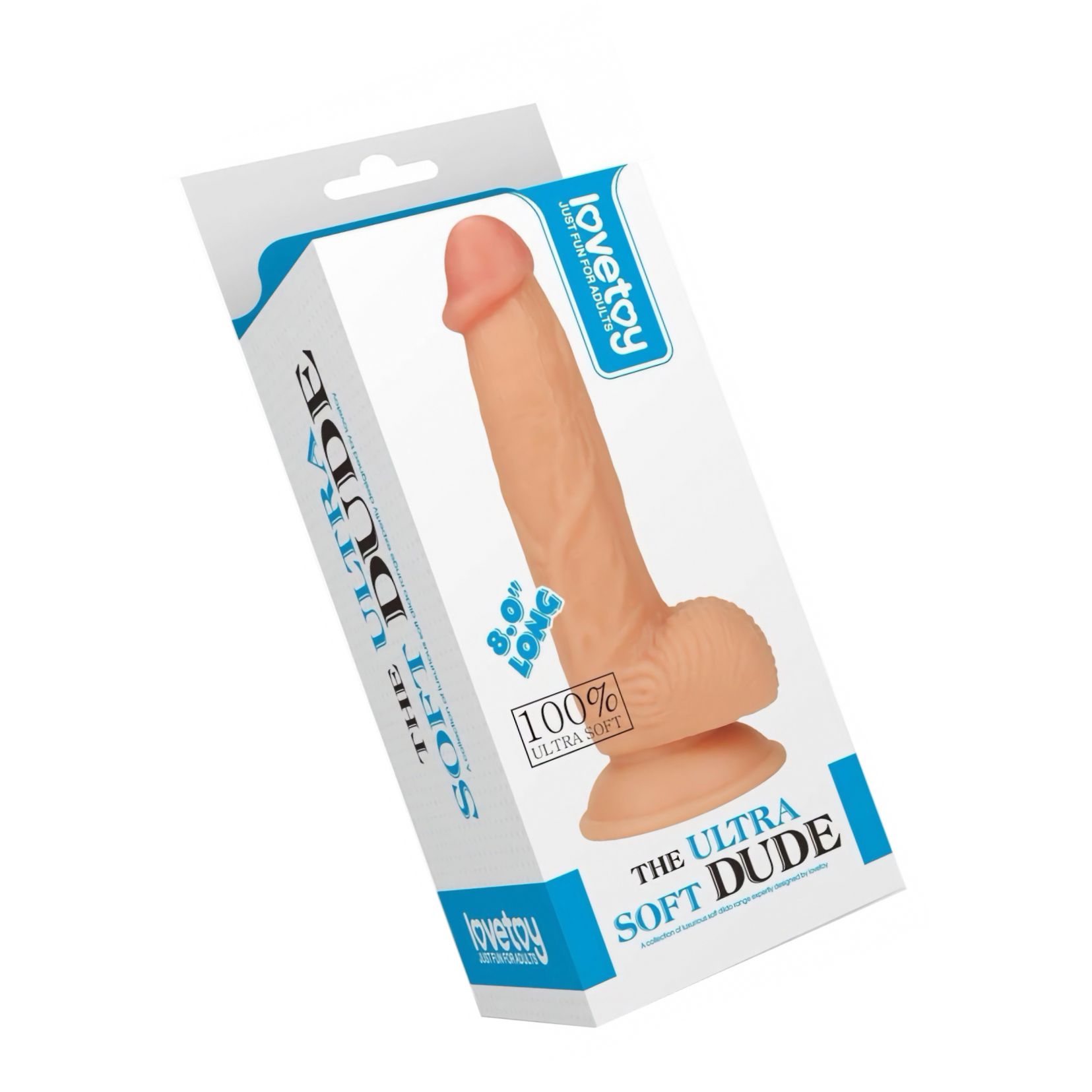 Dildo realist Lovetoy Ultra Soft Dude, 20 cm, din TPE ultra-moale. Ventuză puternică pentru utilizare hands-free, robust la apă. Compatibil cu lubrifianți pe bază de apă. Se poate încălzi în apă caldă. Curățare ușoară.