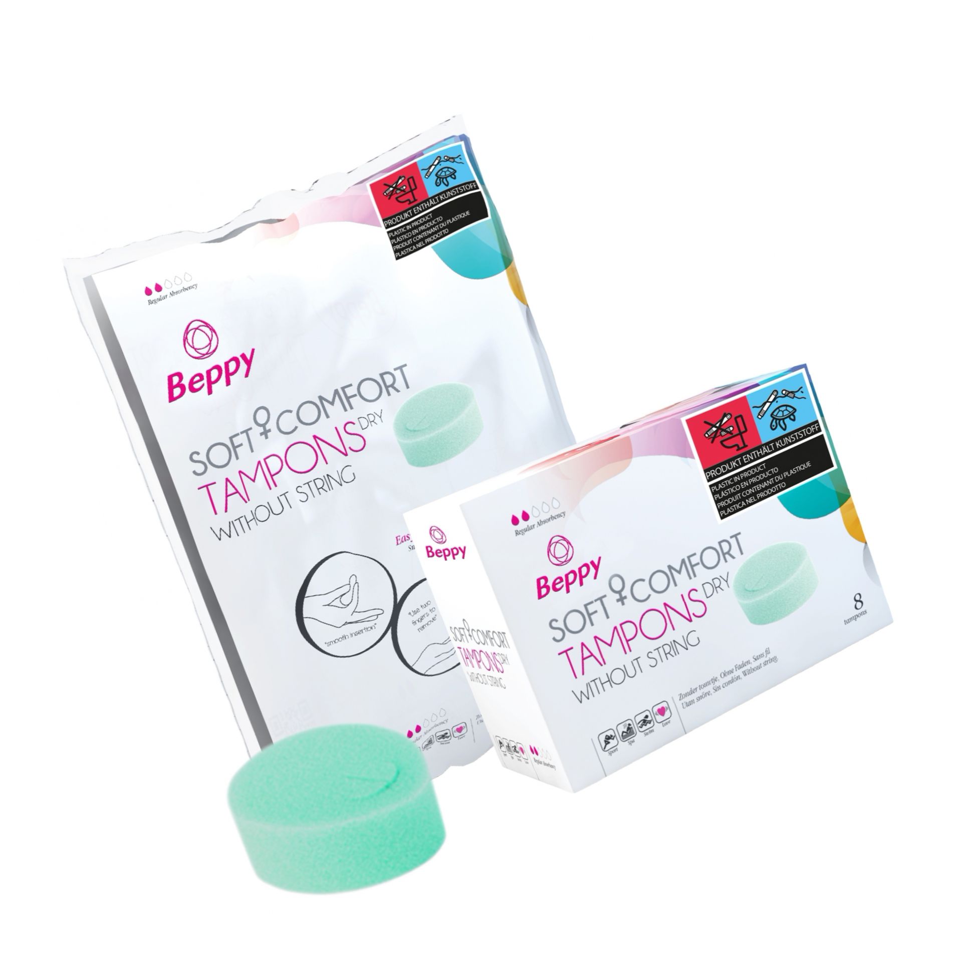 Beppy Dry este un tampon din burete, fără fir, proiectat pentru protecție discretă până la 8 ore în zilele sensibile. Buretele moale se conturează pe corp, dând confort și libertate de deplasare — adecvat pentru înot, sport sau saună.
