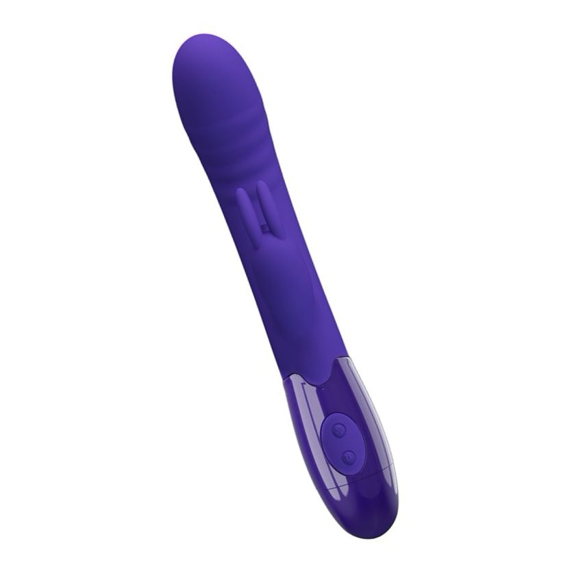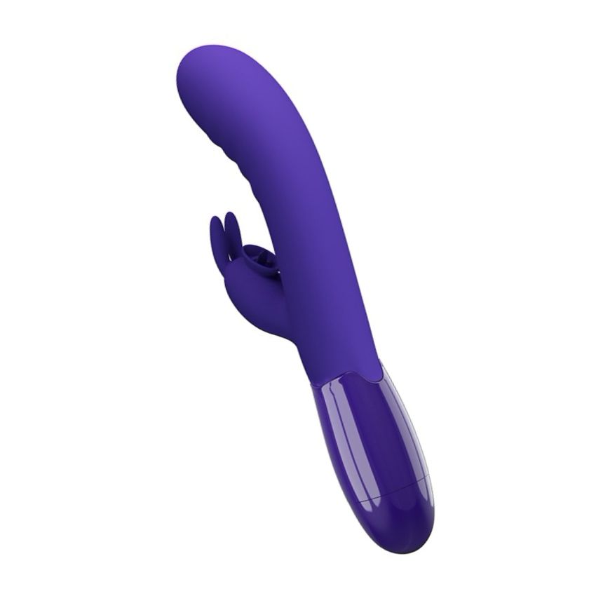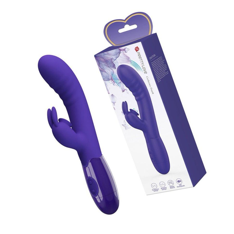 Vibrator rabbit Pretty Love Cerberus Youth — silicon velvet + ABS, cap curbat pentru punctul G și braț clitoral pentru stârnire directă. 30 programe de vibrație, cu acumulator și viguros la apă. Textură catifelată, estetică compact.