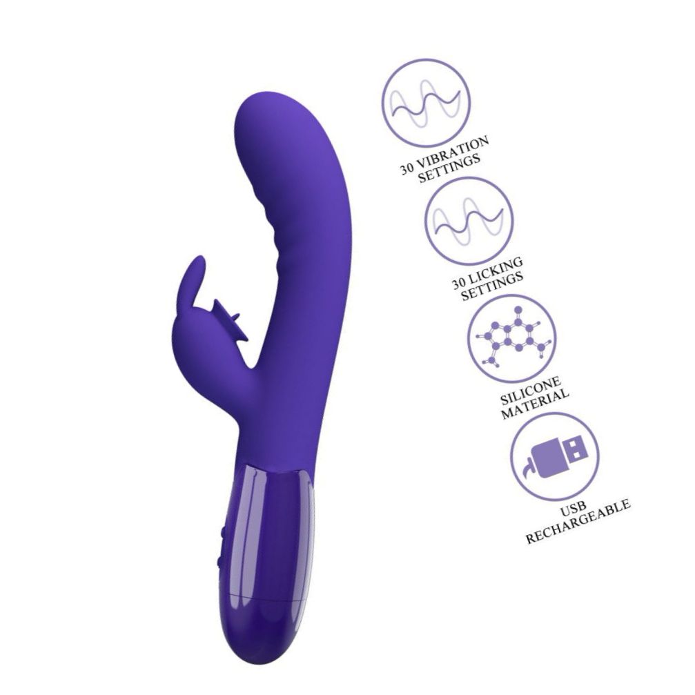 Pretty Love Cerberus Youth este un vibrator tip rabbit, făcut pentru stârnire multiplă și reglaje fine. Capul curbat țintește punctul G, iar brațul mic tip bunny oferă contact direct și precis cu clitorisul. Dispune de 30 de programe de vibrație pentru a adapta forța după preferințe.