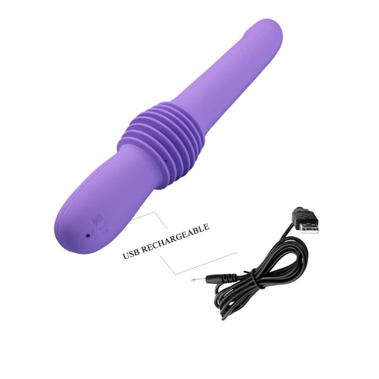 Vibrator Pretty Love Pazuzu Purple: pistonare până la 7 cm, 3 moduri, silicon moale violet, ansamblu de prindere ergonomic și încărcare USB. Discret, trainic la apă și ușor de curățat.