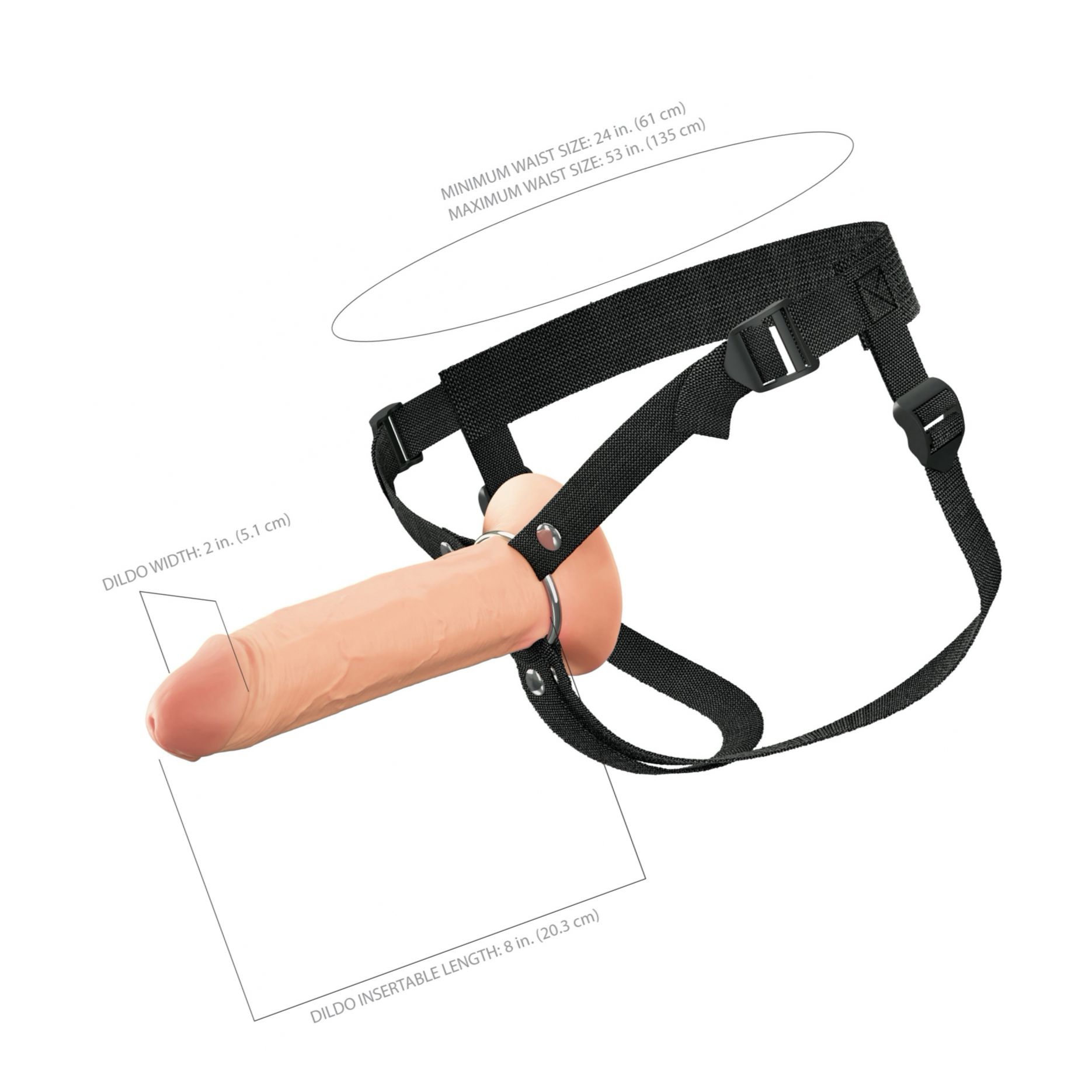 Beneficii și atribute: - Silicon dual density: exterior moale și partea interioară ferm pentru senzație naturală și rezistență - Interior gol pentru creștere ușoară și susținere stabilă - Lungime totală 21,6 cm; adâncime inserabilă 20,3 cm; calibru exterior 5 cm - Bază rotundă și flexibilă pentru confort la purtare - Ham din nylon reglabil, cu inel metalic pentru stabilire sigură - Resurse durabile: silicon, ABS, metal, nylon