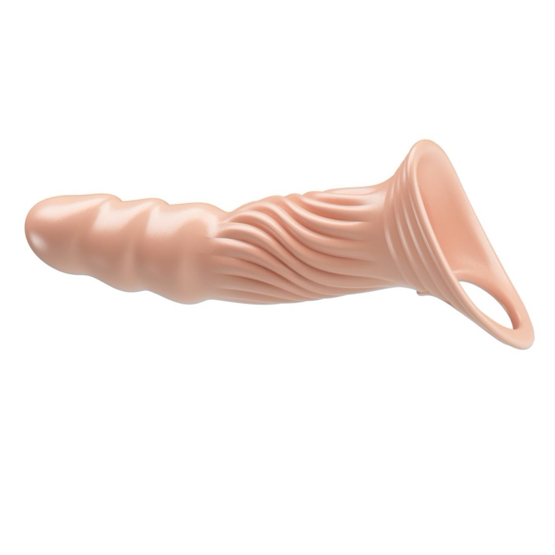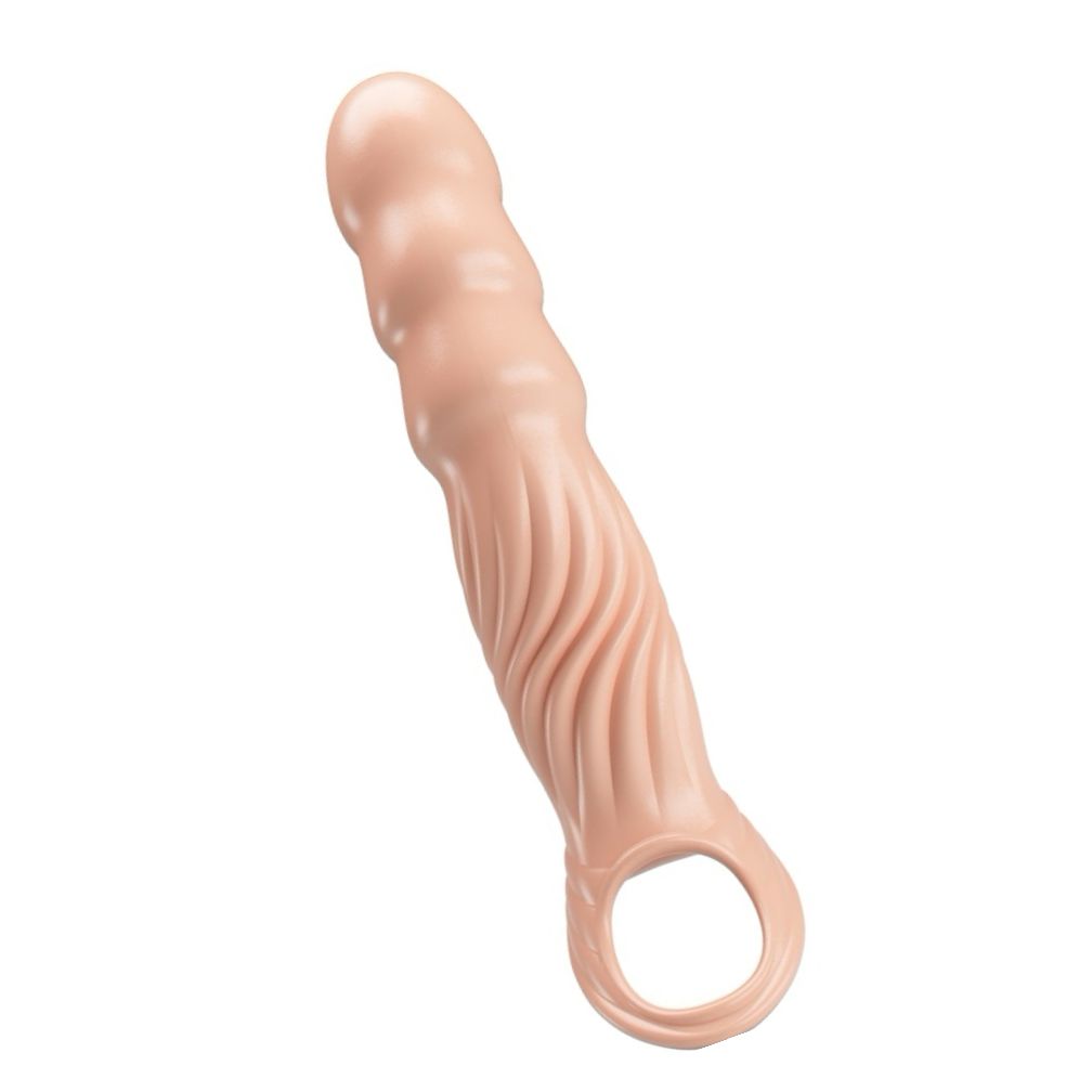 Extensie peniană din TPE, concepută pentru un formă și o senzație cât mai apropiate de realitate. Textura venată și capul pronunțat transmite un alură natural, iar materialul moale păstrează luxul în utilizare.