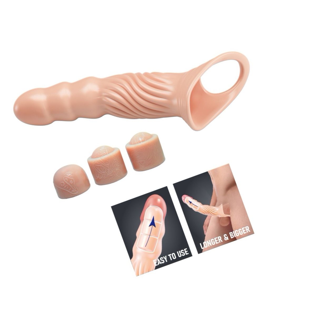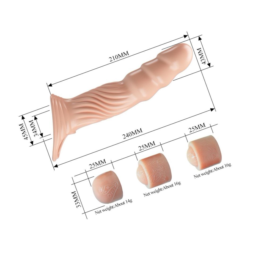Extensie penian din TPE, ultra-realistă, cu textură venată și cap pronunțat. Curea pentru scrot asigură fixarea. Include 3 extensii interioare detașabile (1 inch fiecare) pentru reglaj.