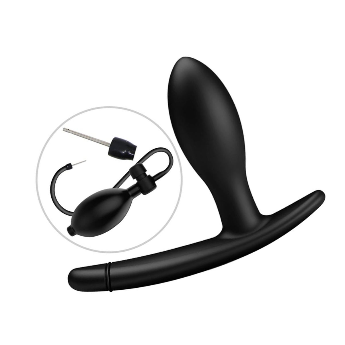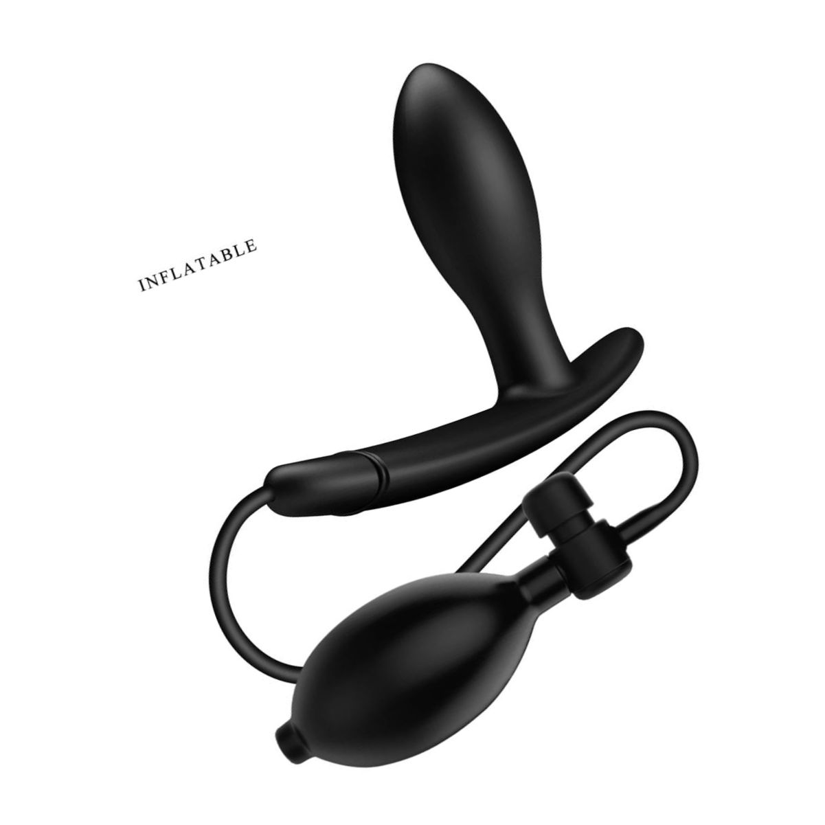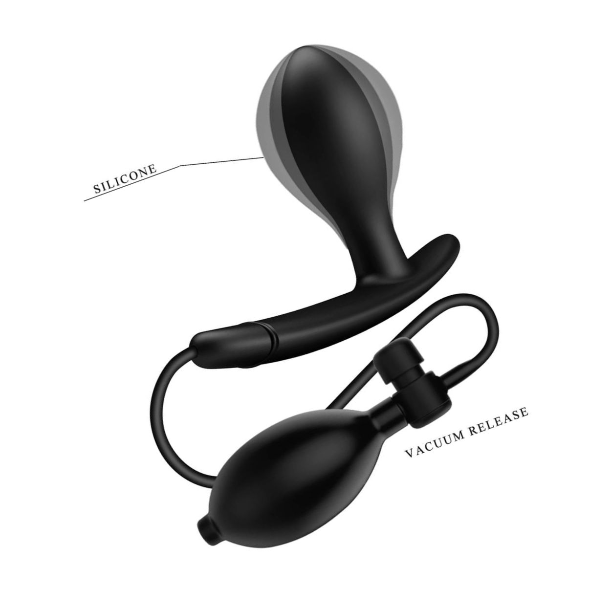 Plug anal gonflabil Pretty Love Drake — silicon negru, pompă manuală cu supapă pentru umflare controlată, bază stabilizatoare și distribuție uniformă a aerului. Recomandat cu lubrifiant pe bază de apă. Lungime 7,8 cm, calibru 2,6 cm.