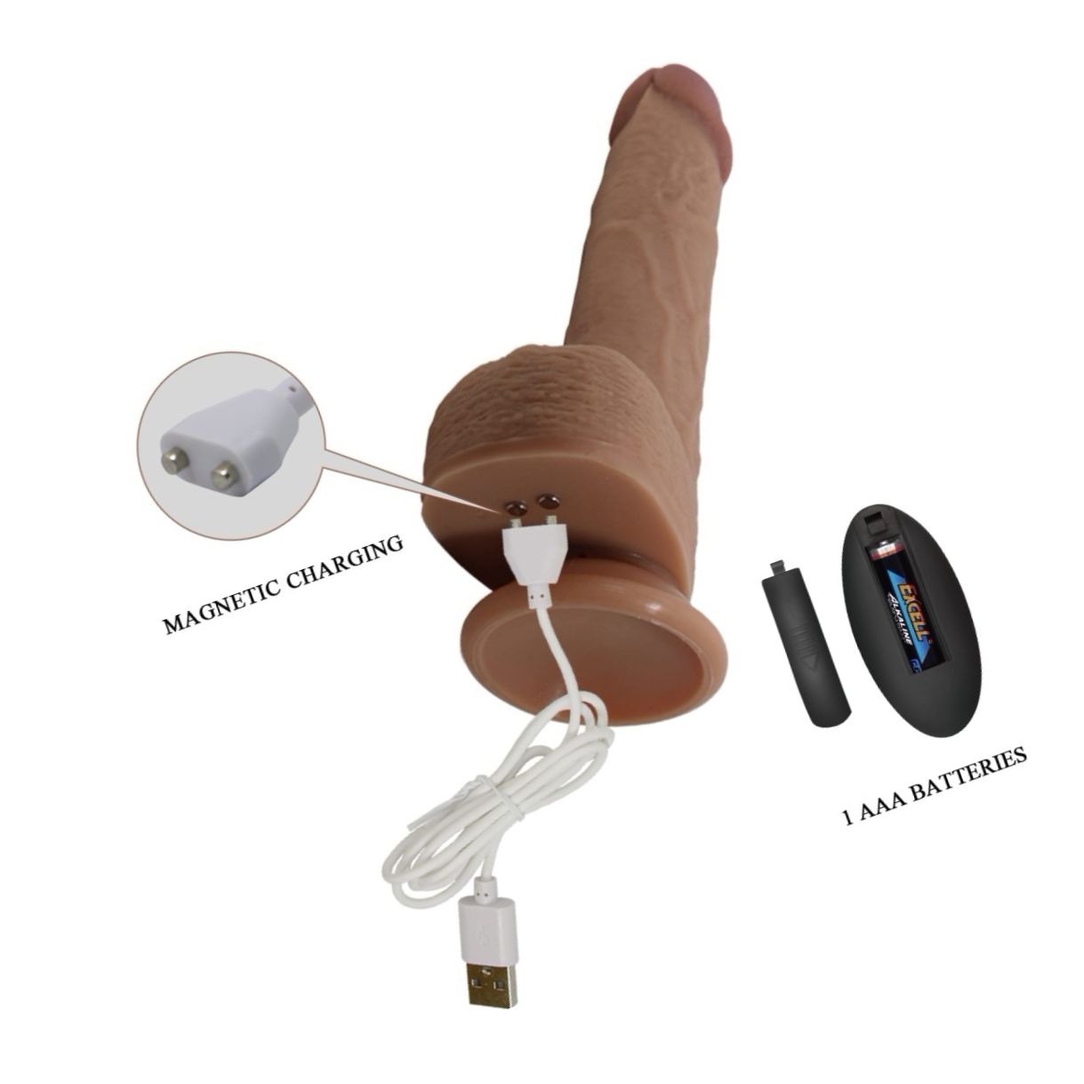 Beneficii și atribute: - Design realist și textură moale din silicon - Ventuză puternică pentru utilizare hands-free - Control separat pentru vibraţie și împingere (telecomandă) - Cu acumulator prin port magnetic, fără baterii de unică folosinţă - Ferm dar flexibil: combinaţie de stabilitate și adaptabilitate