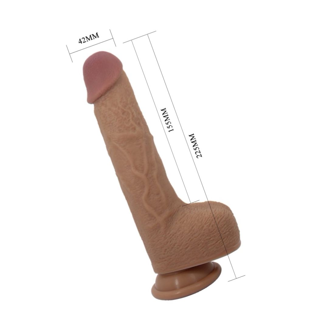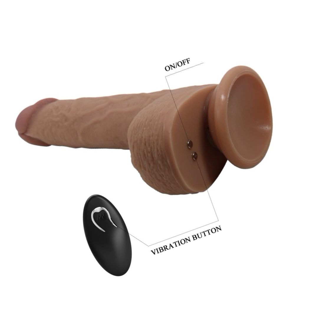 Vibrator realist Pretty Love Tommy, din silicon moale, cu ventuză puternică pentru utilizare hands-free. Combină 3 moduri de vibraţie şi 3 de împingere, controlabile separat cu telecomanda. Cu acumulator prin port magnetic.