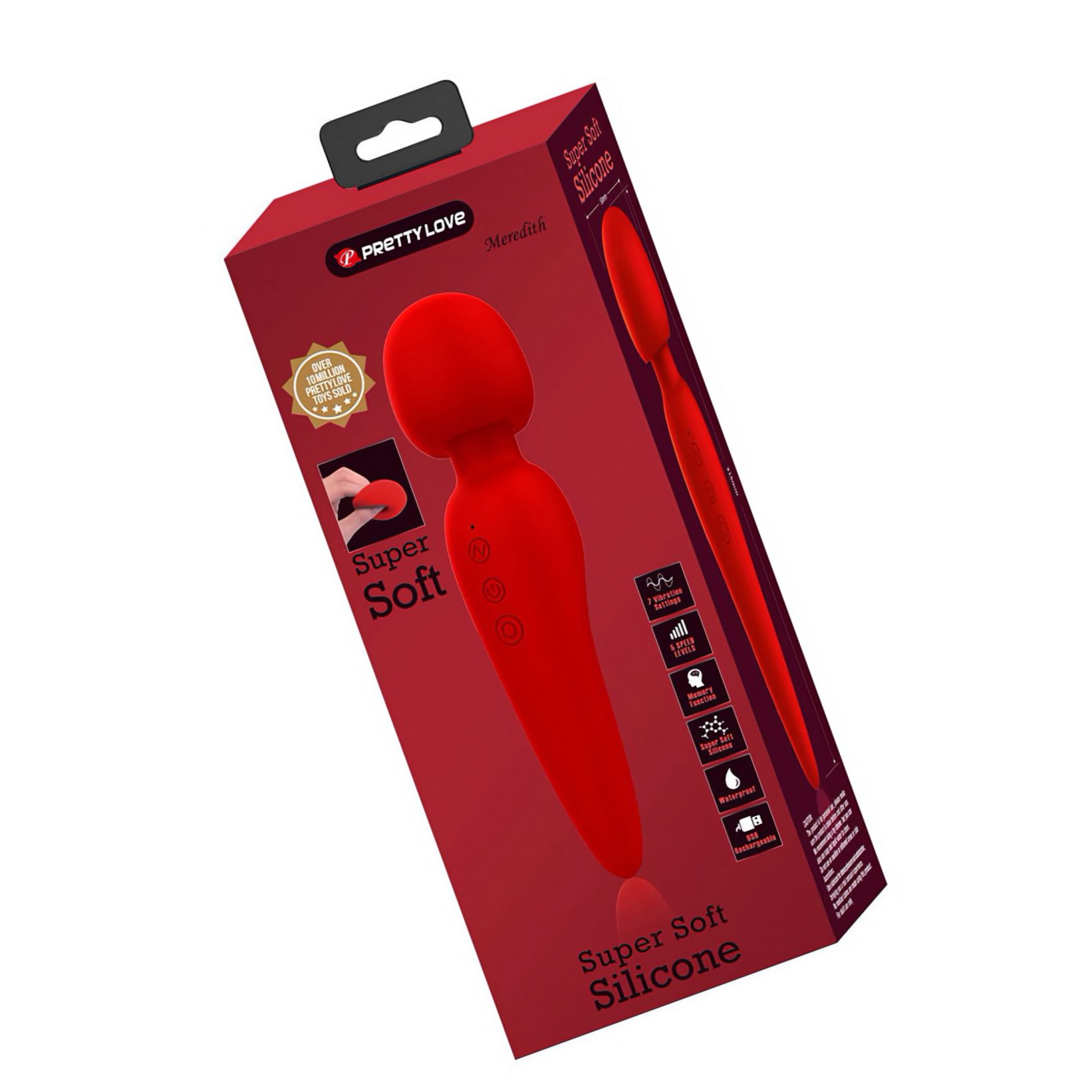 Wand Pretty Love Meredith: cap flexibil din silicon moale, 7 maniere de vibraţie, reîncărcabil şi 100% durabil la apă. Compact (21.5 cm) şi uşor de manevrat — perfect pentru baie sau duş.