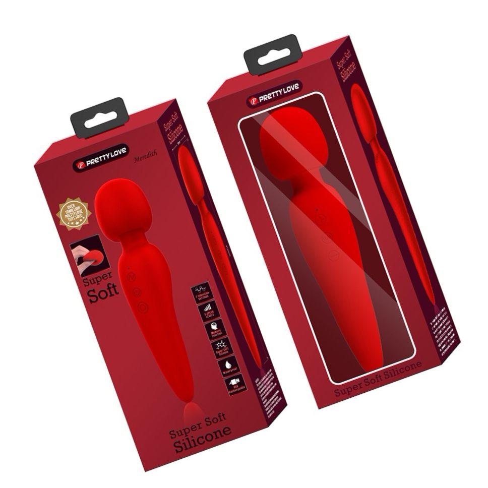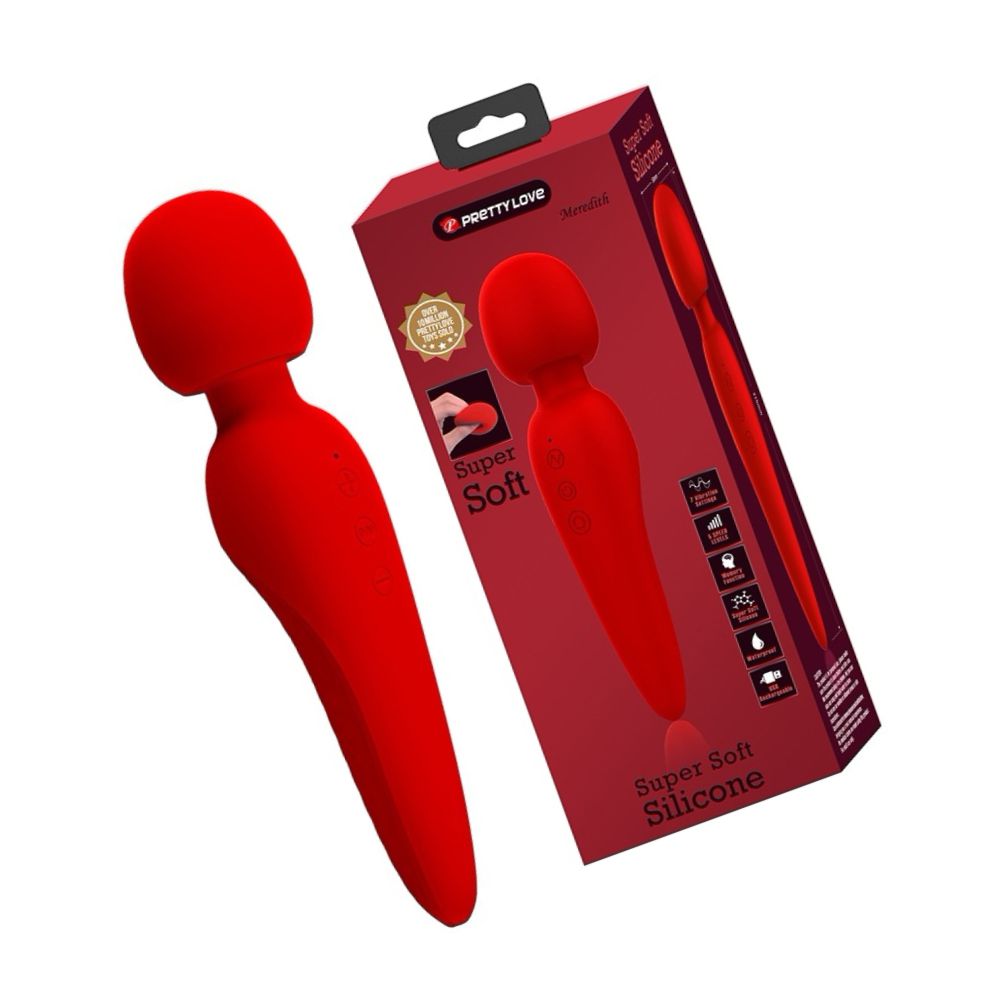 Wand Pretty Love Meredith: cap flexibil din silicon moale, 7 feluri de vibraţie, reîncărcabil şi 100% durabil la apă. Compact (21.5 cm) şi uşor de manevrat — ideal pentru baie sau duş.