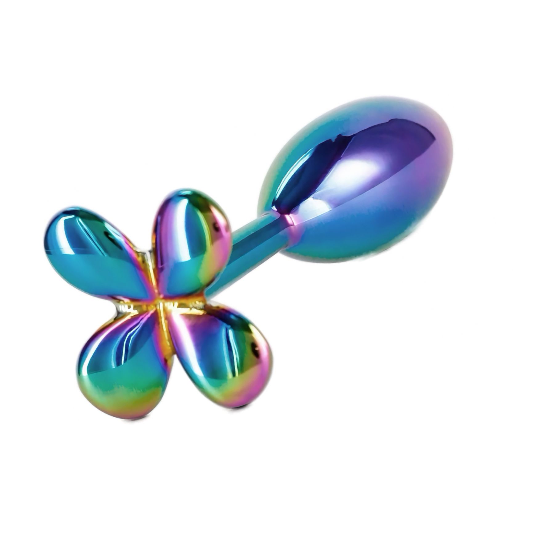 Dop anal metalic NS Clover, finisaj cromat multicolor. Bază în înfățișare de trifoi cu 4 foi, design compact și ușor, sigur pentru corp. Aluminiu neted, compatibil cu absolut orice lubrifiant, ușor de purificat — desăvârșit pentru începători.