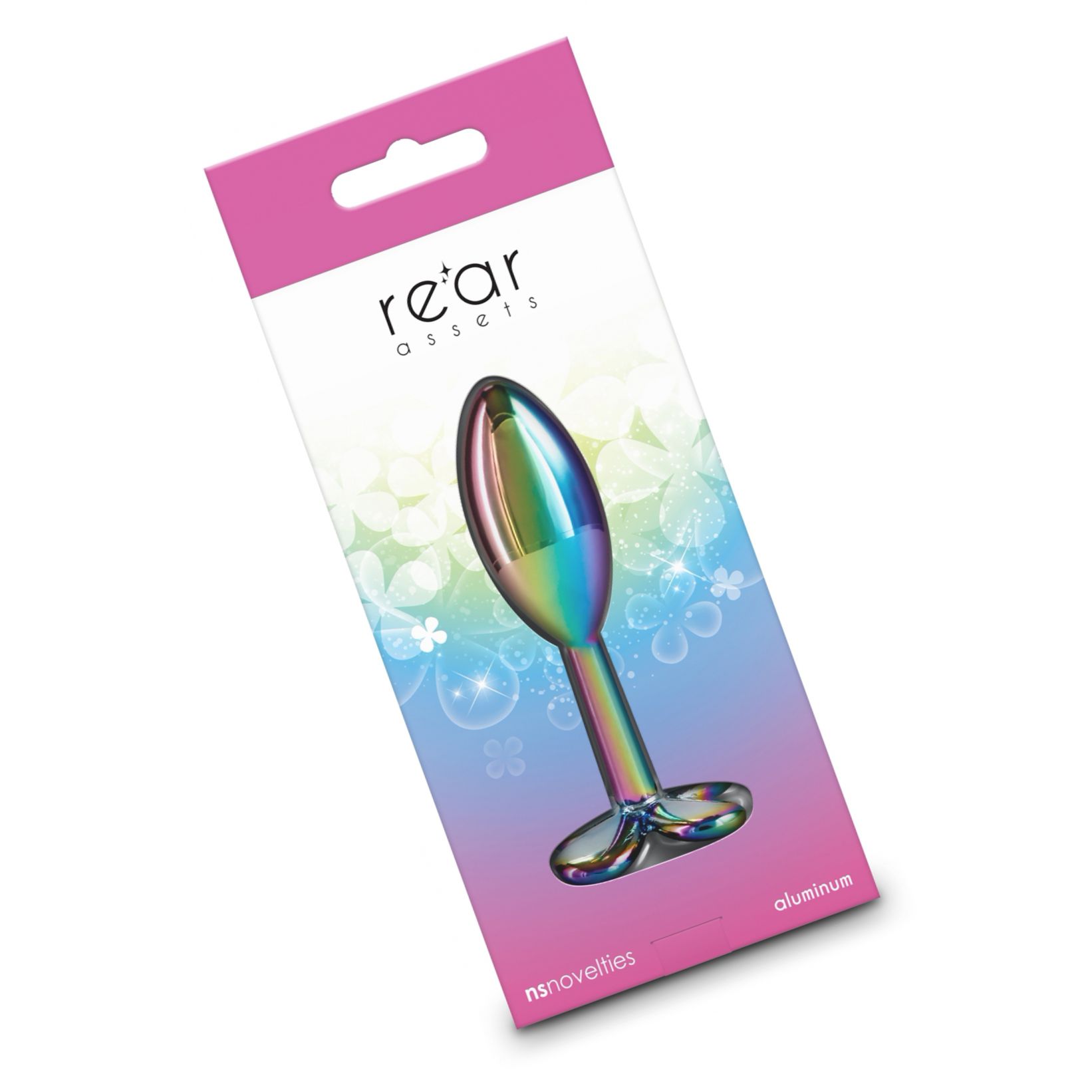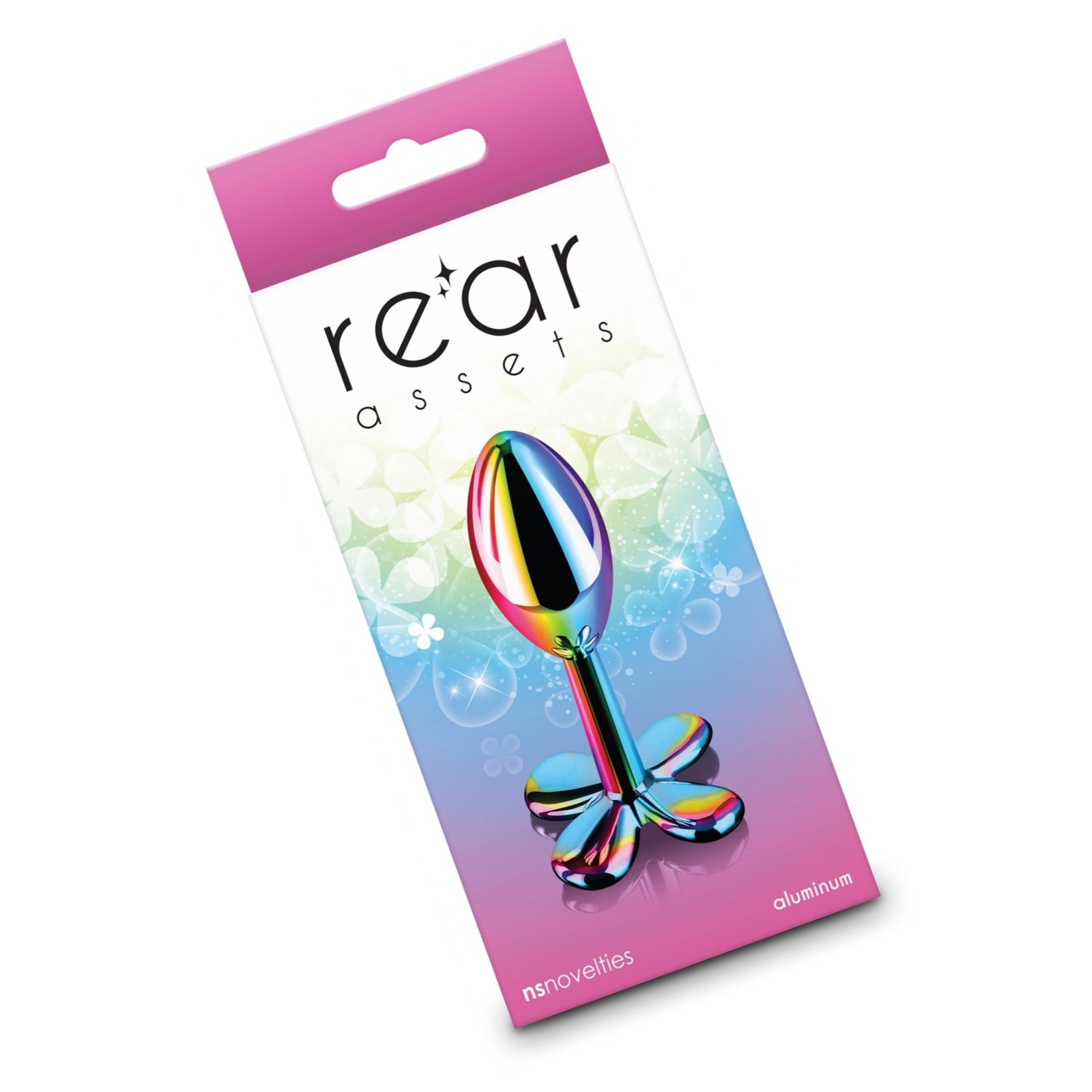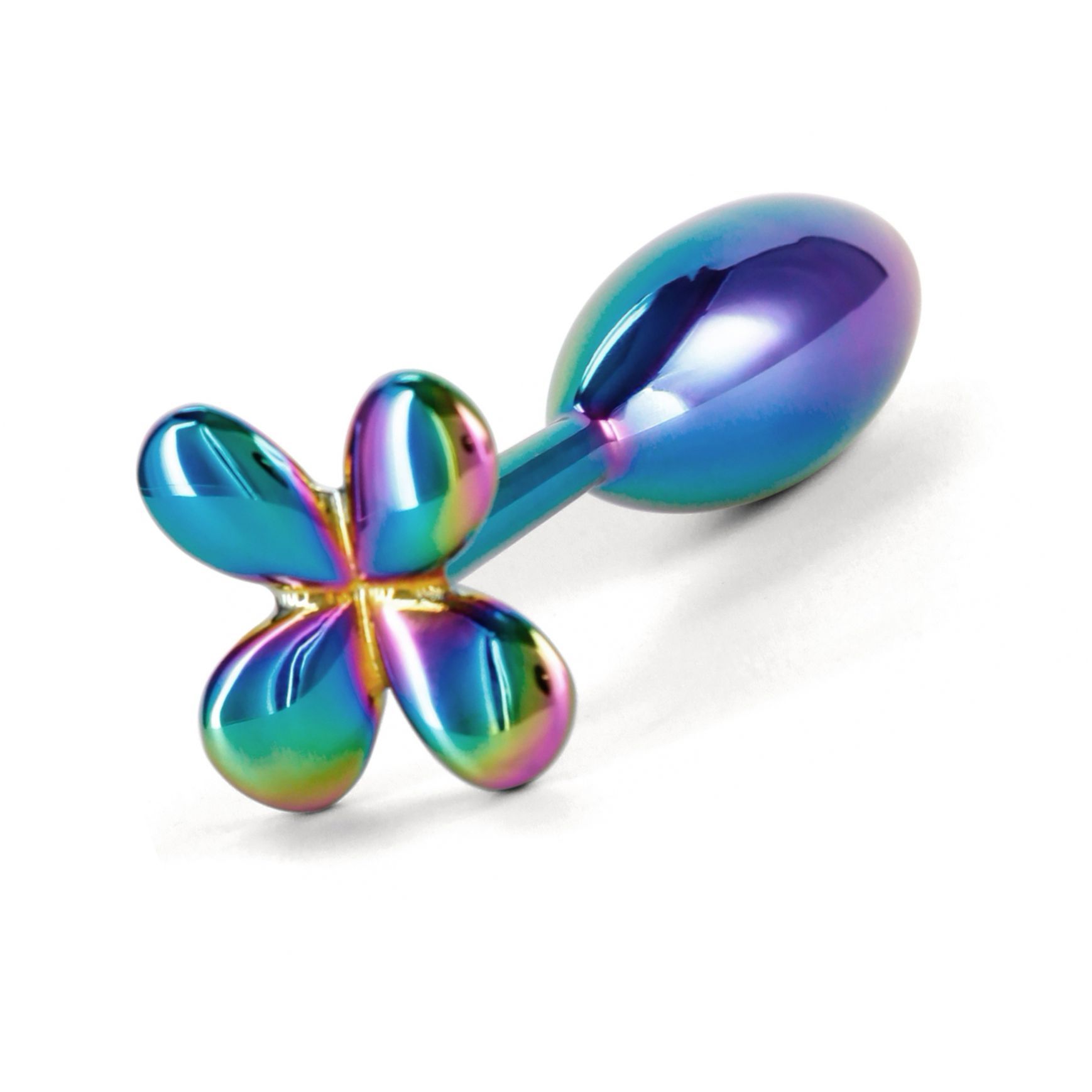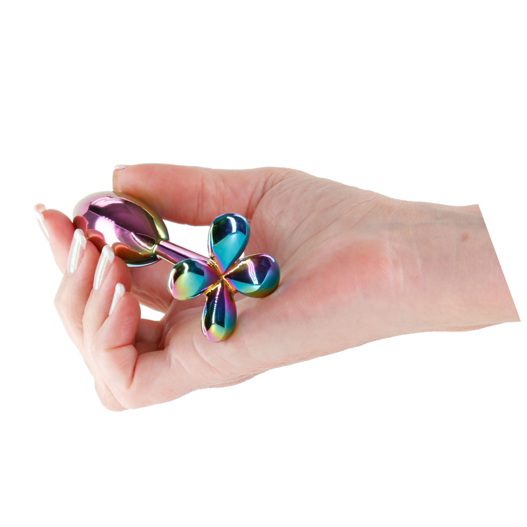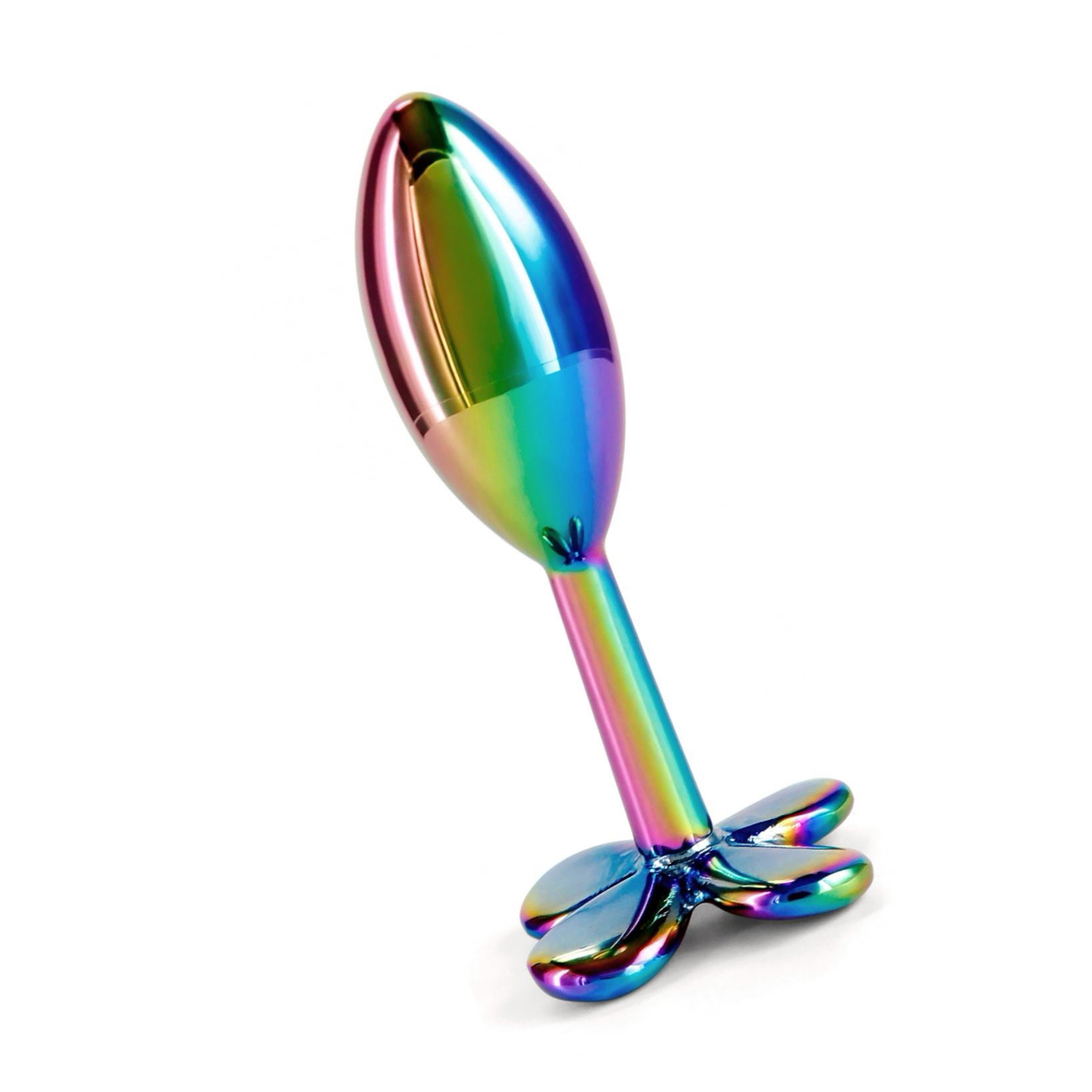 Dop anal metalic NS Clover, finisaj cromat multicolor. Bază în aspect de trifoi cu 4 foi, design compact și ușor, sigur pentru corp. Aluminiu neted, compatibil cu orice lubrifiant, ușor de curățat — ideal pentru începători.