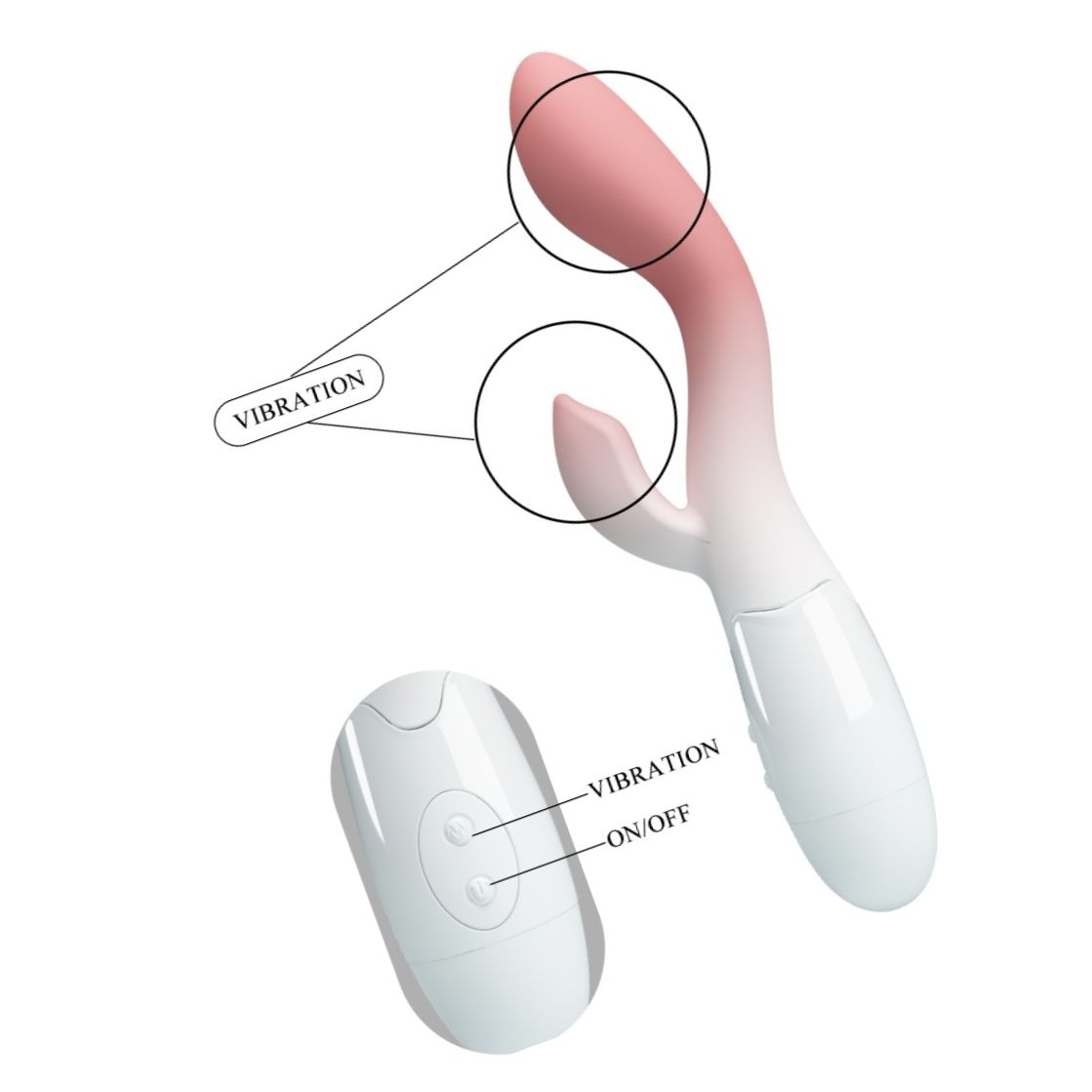 Beneficii și atribute: - Stârnire simultană a punctului G și a clitorisului - 30 maniere de vibrație pentru ajustări fine - Formă flexibilă care menține contactul - Motor viguros pentru vibrații eficiente - Control simplu și intuitiv - Stil ergonomic, confortabil și discret - Material: silicon; culori: roz și alb - Impermeabil; alimentare: 2 x AAA