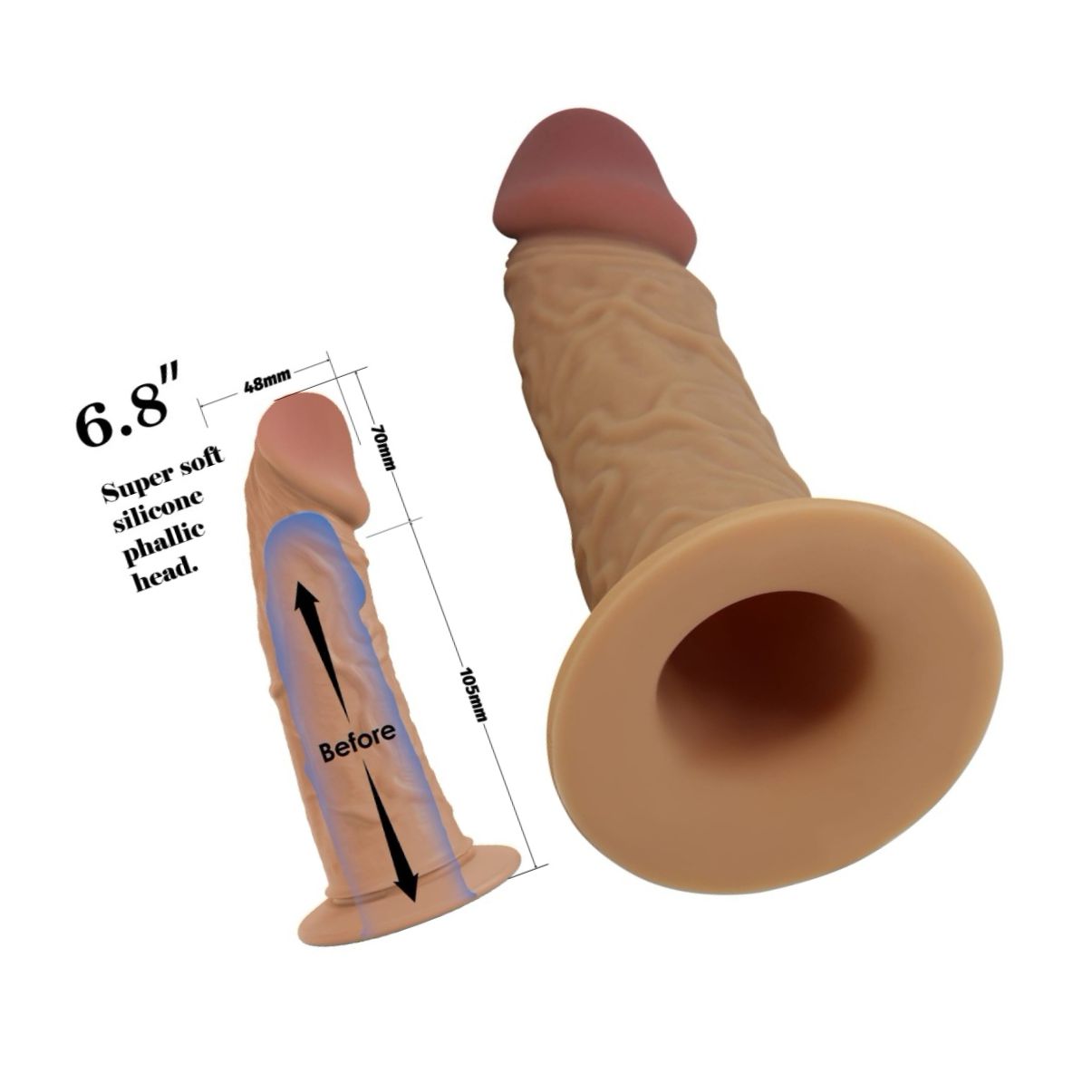 Dimensiuni cheie: lungime nealterată tija 17,5 cm, mărime inserabilă 10 cm, diametru 4,8 cm. Crește penisul cu circa 7 cm.