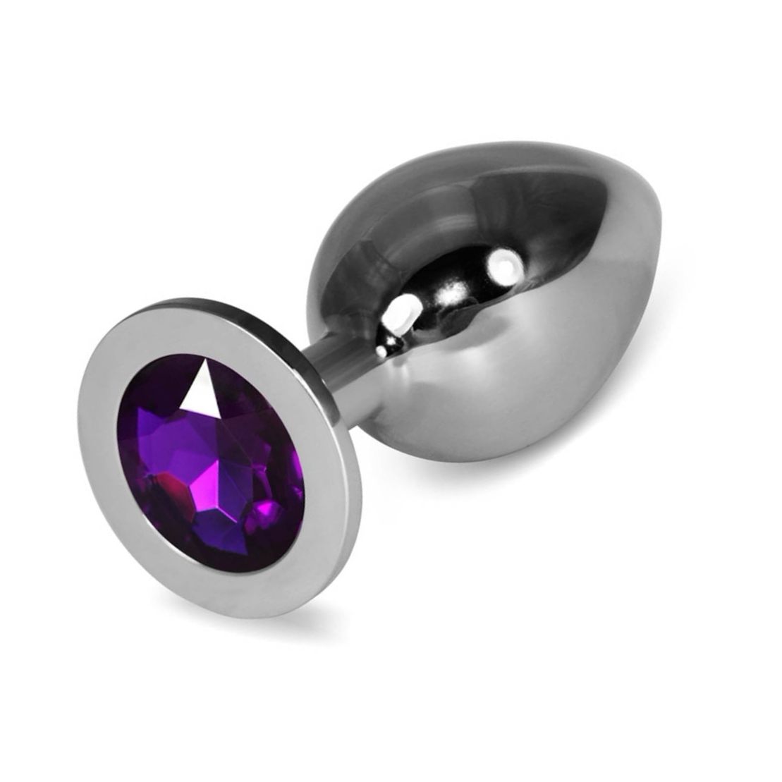 Plug anal clasic din metal, dimensiunea L, vârf rotunjit, gât subțire și bază cu bijuterie mov. Finisaj lucios, fără nichel, împachetat în cutie cadou și săculeț de catifea. Stil stabil și senzație solidă, ideal pentru colecție privată.