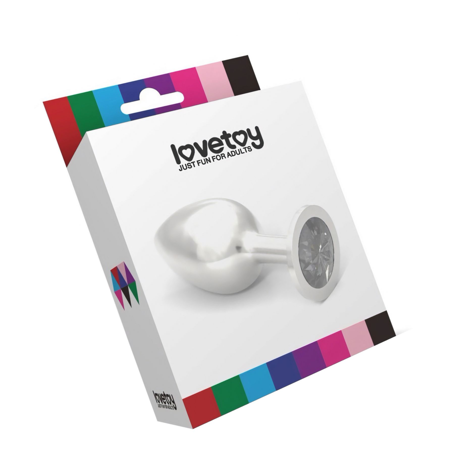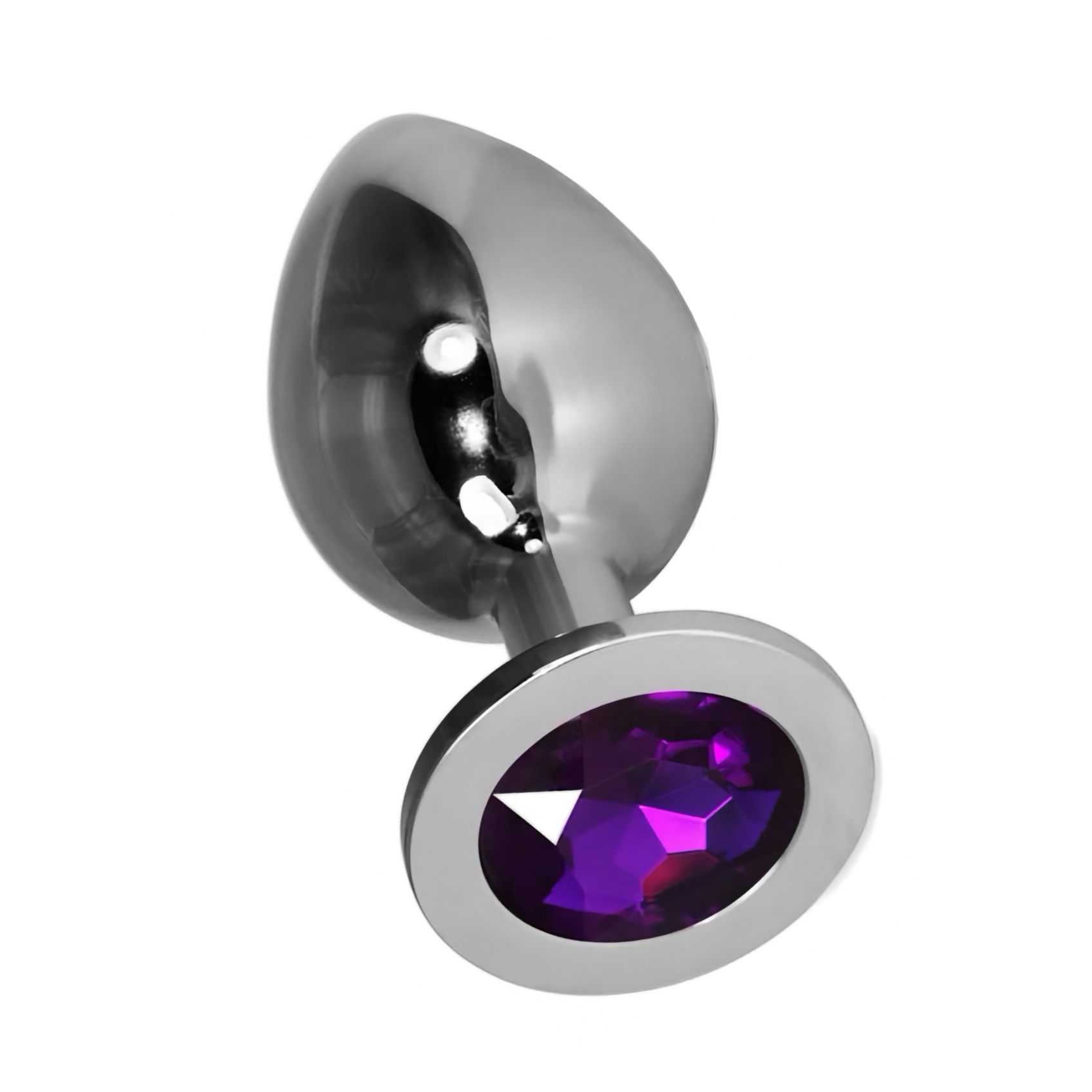 Plug anal tradițional din metal, măsura L, vârf rotunjit, gât subțire și bază cu bijuterie mov. Finisaj lucios, minus nichel, ambalat în cutie cadou și săculeț de catifea. Estetică stabil și senzație solidă, ideal pentru colecție privată.