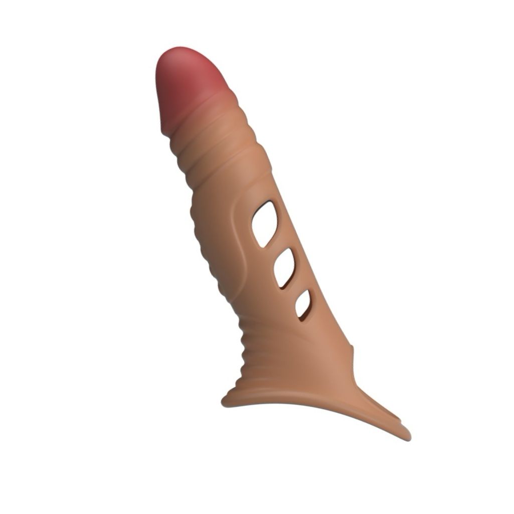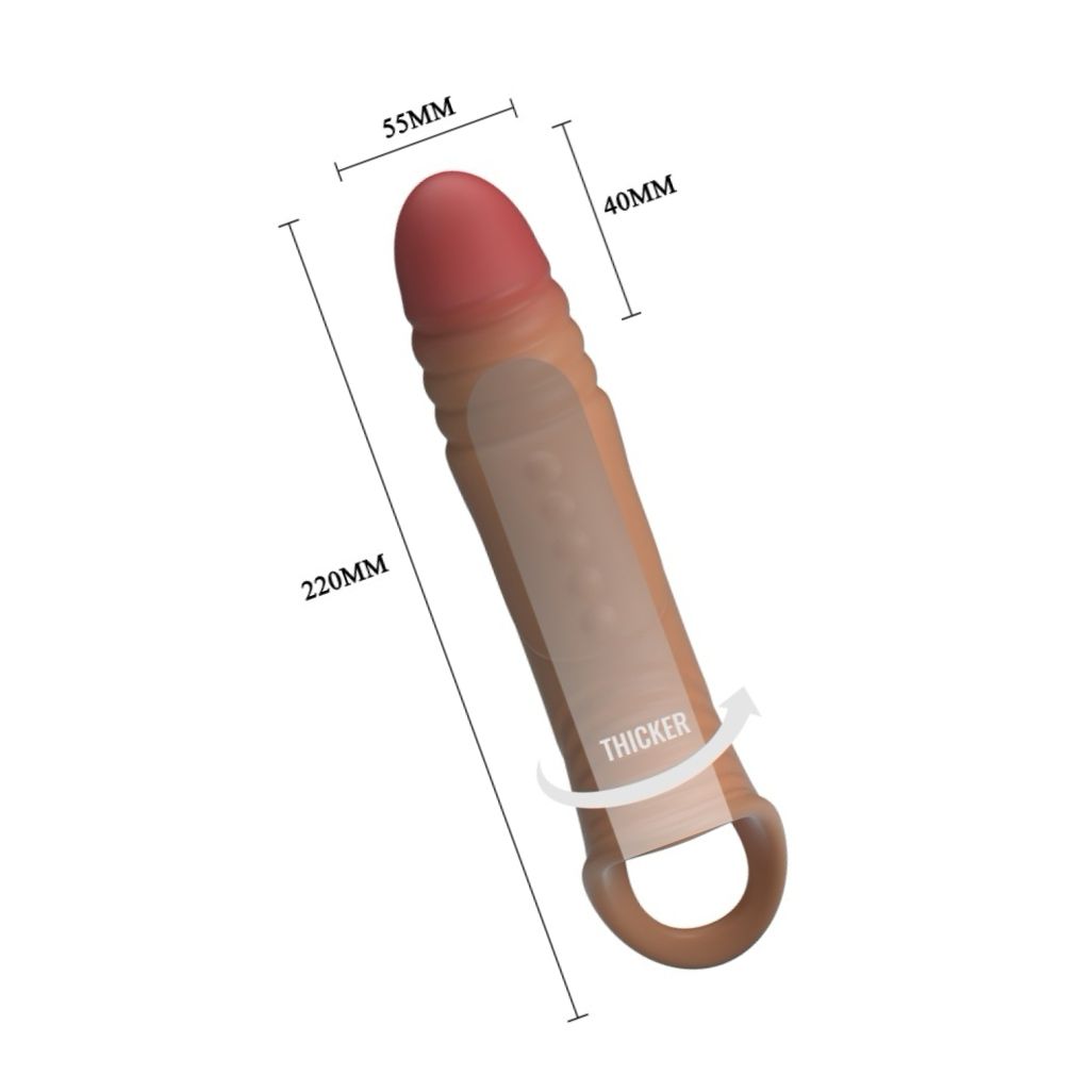 Extensie mădular din TPE cu cap pronunţat, curea pentru testicule şi mini‑vibrator în manşon. Adaugă volum şi lungime (21–25 cm), se fixează ferm pentru stabilitate. Material moale, textură realistă, alură flesh.