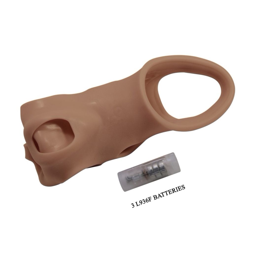 Manşon din TPE, realizat pentru a asigură mai multă consistenţă şi lungime. Capul pronunţat transmite un profil mai definit, iar cingătoare pentru testicule menţine manşonul înțepenit în poziţie. Mini‑vibratorul integrat în manşon aduce stârnire directă.