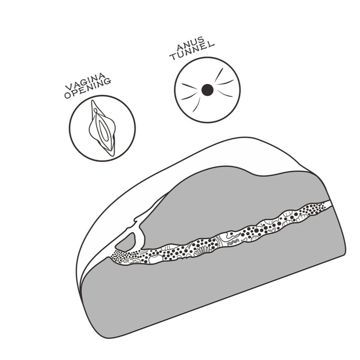 Beneficii şi caracteristici: - Material TPE sigur pentru corp, ultra-moale, inodor, non-adeziv - Două intrări cu texturi diferite (intrare principală şi intrare secundară anală) pentru variaţie - Tunel partea interioară cu protuberanţe pentru stârnire diversificată - Stil ergonomic, uşor de manevrat şi poziţionat - Curăţare facilă: clătire directă şi uscare rapidă - Excluzând ftalaţi şi minus latex - Corespunzător cu lubrifianţi pe bază de apă