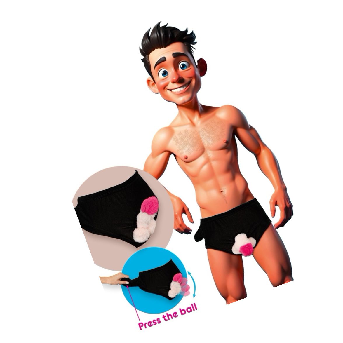Boxeri innegriti cu membru plușat gonflabil și bilă‑pompă ascunsă pentru rigidizare instant. Mărime unică, material 100% poliester. Cadou amuzant pentru petreceri, carnaval sau burlăcie. Spălare manuală.