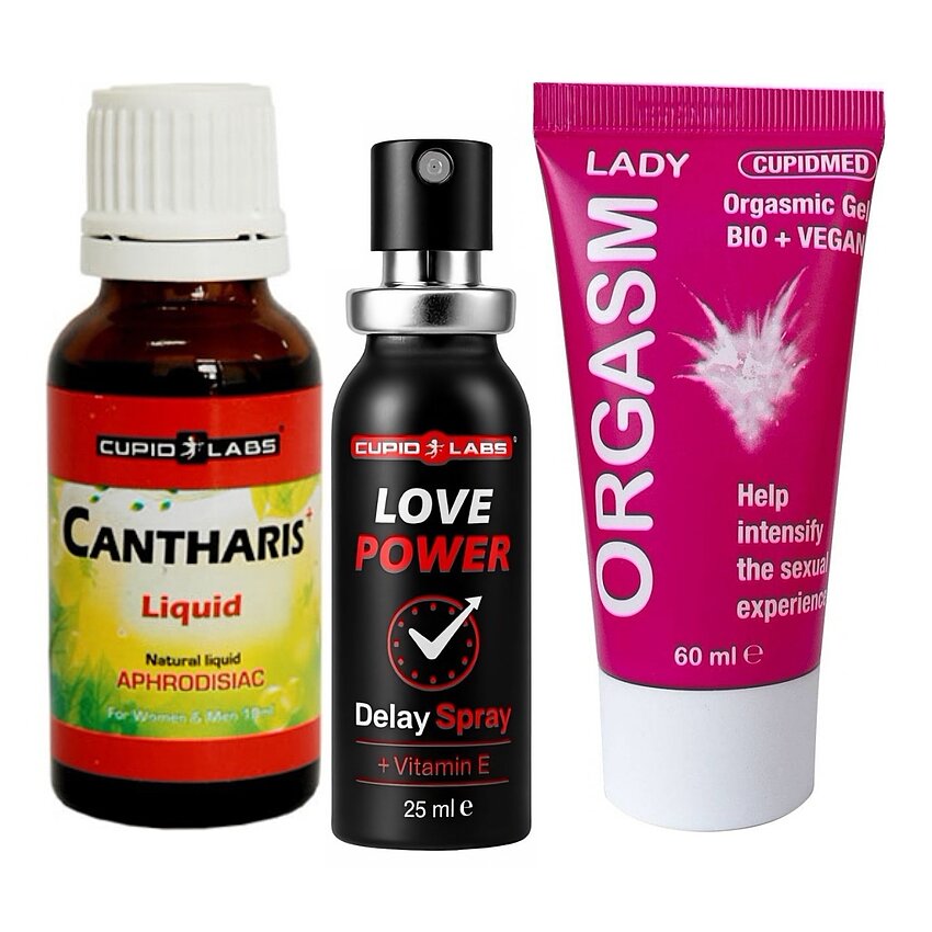 Trio-ul perfect pentru nopți pline de satisfacție: control pentru el, amplificare pentru ea și un impuls normal al dorinței pentru amândoi. Folosiți picăturile cu 30 min înainte, spray-ul pentru control înainte de atingere și gelul în preludiu sau la masaj.