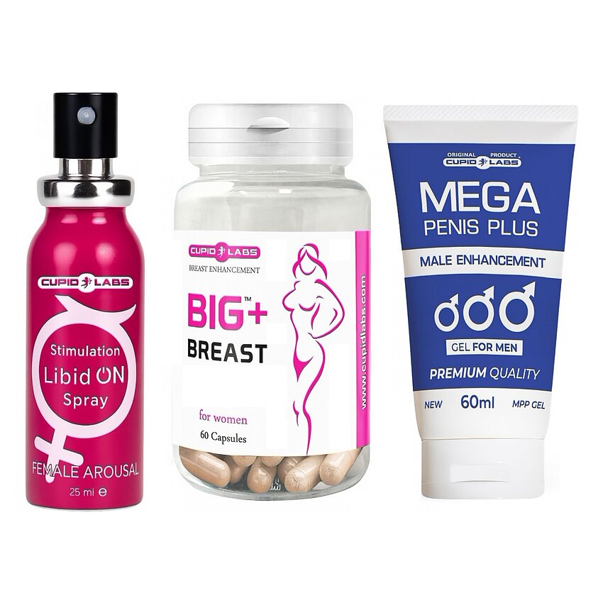 Set conceput pentru serile în care vreți mai mult: supliment pentru fermitate și volum al sânilor, gel pentru extinderea și surescitarea falusului și spray care crește sensibilitatea feminină. Se folosesc complementar — tratament zilnic, masaj și pulverizare înainte de preludiu.