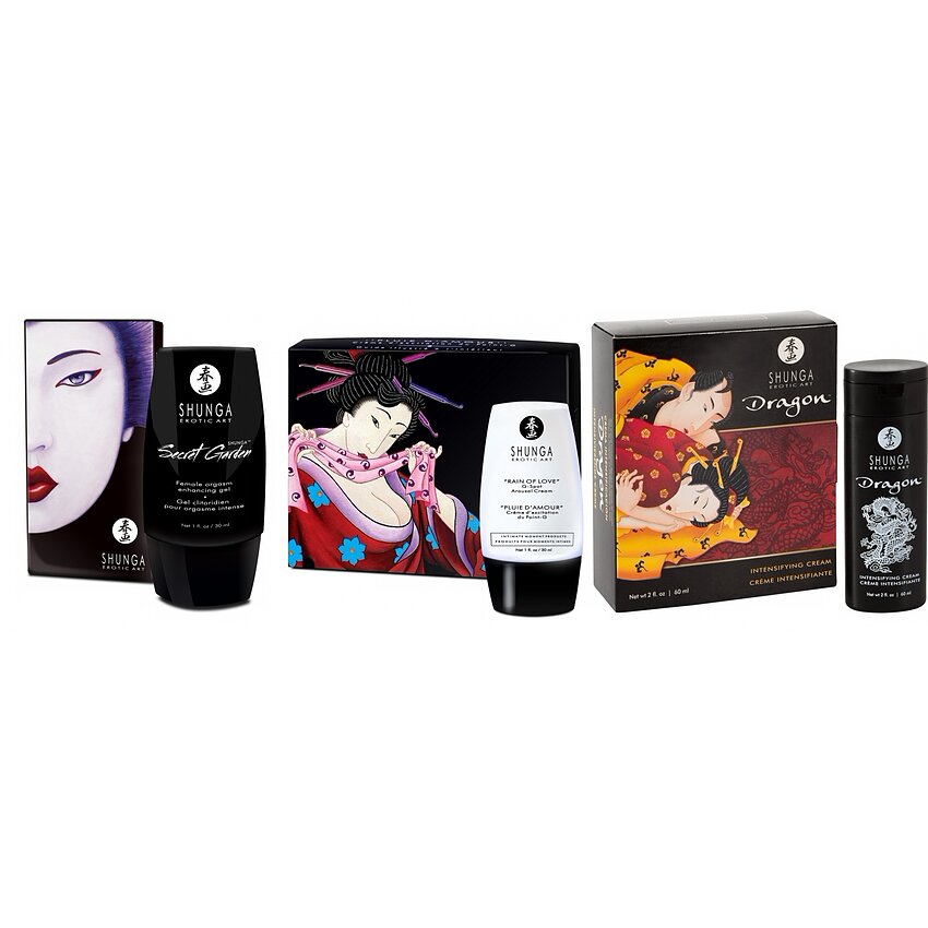 Detalii produs: - Cremă Dragon Virility (60 ml): formula pe bază de extracte naturale furnizează emoții alternante de căldură și răcoare, ajută erecții mai ferme și prelungite și contribuie la mărirea vitalității. Textură lubrifiantă, adecvată pentru utilizare atât solo, cât și în cuplu; efecte resimțite pe durata de aproape 30–45 minute. - Cremă Ploaia Dragostei – stârnire punct G (30 ml): special concepută pentru aplicare internă, mărește sensibilitatea zonei G și poate favoriza plăceri sexuale puternice sau ejaculare feminină; include recomandări de explorare și funcționează excelent împreună cu jucării dedicate. - Secretul Clitorisului (30 ml): cremă de lux pentru surescitarea externă, o cantitate mică e suficientă pentru a intensifica climaxul și lubrifierea; acordă efecte de încălzire și răcorire, este pe bază de apă și compatibilă cu latexul; cam 30 de aplicații per flacon.