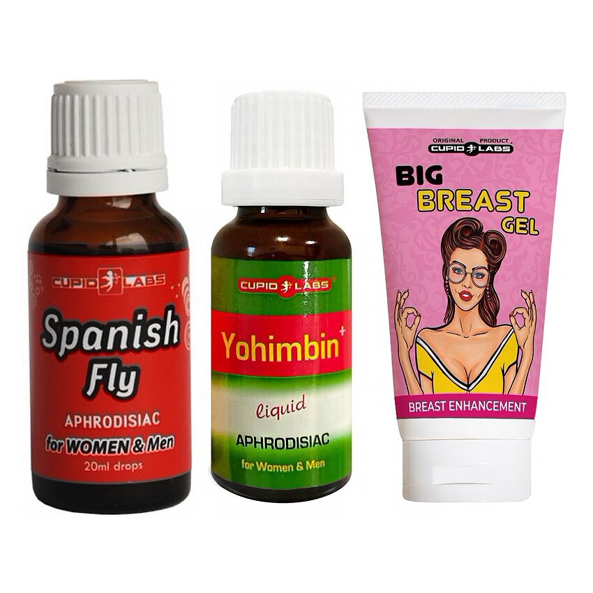 Detalii și consecințe ale produselor: - Gel pentru alungirea sânilor (60 ml): formulă pe bază de vegetale care hrănește și tonifică, ideal pentru masaj regulat; contribuie la un aspect mai ferm și la senzații tactil-plăcute în timpul preludiului. - Picături Spanish Fly (20 ml): elixir natural pentru amplificarea libidoului, conceput pentru a intensifica excitația și senzațiile în cele două sexe; se administrează în lichid sau sub limbă pentru un urmare rapid. - Yohimbin Drops (20 ml): extract natural recunoscut pentru ajutorul circulației și a energiei sexuale; ajută la creșterea vigorii și la menținerea unei performanțe mai susținute.