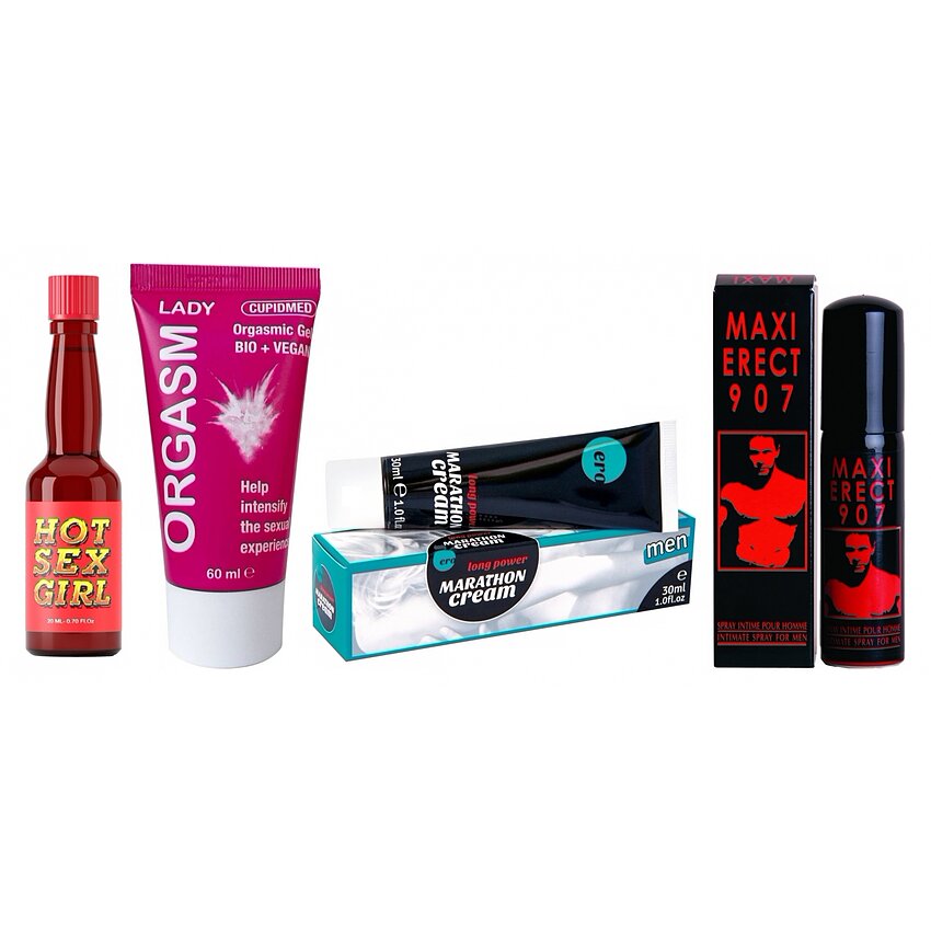 Transformă seara într-un maraton al plăcerii: pentru ea, gel sensibilizant și picături afrodisiace; pentru el, atomizator pentru erecție rapidă și unguent pentru rezistență. Produsele se completează ușor pentru mai multă intimitate, excitare și control.