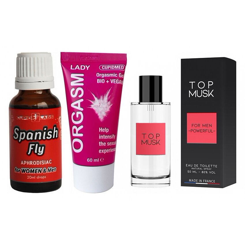 Detalii despre produse: - Gel pentru femei (60 ml): soluție hipoalergenică, fără parfum, cu efect de încălzire şi furnicături plăcute care sporesc receptivitatea zonelor intime. Textura ușoară se absoarbe uşor şi este compatibilă cu alte produse intime. - Picături afrodiziace (20 ml): elixir pe bază naturală, plămădit pentru a amplifica libido-ul atât la femei, cât şi la bărbaţi. Doar câteva picături activează atenţia şi vitalitatea erotică, ajutând la o dispoziție mentală mai deschisă şi la intensificarea excitării. - Esenţă cu feromoni (50 ml): mireasmă musk masculină, realizată pentru a accentua farmecul şi încrederea. Pulverizată discret, compune o aură seducătoare şi atrage atenţia în mod subtil.