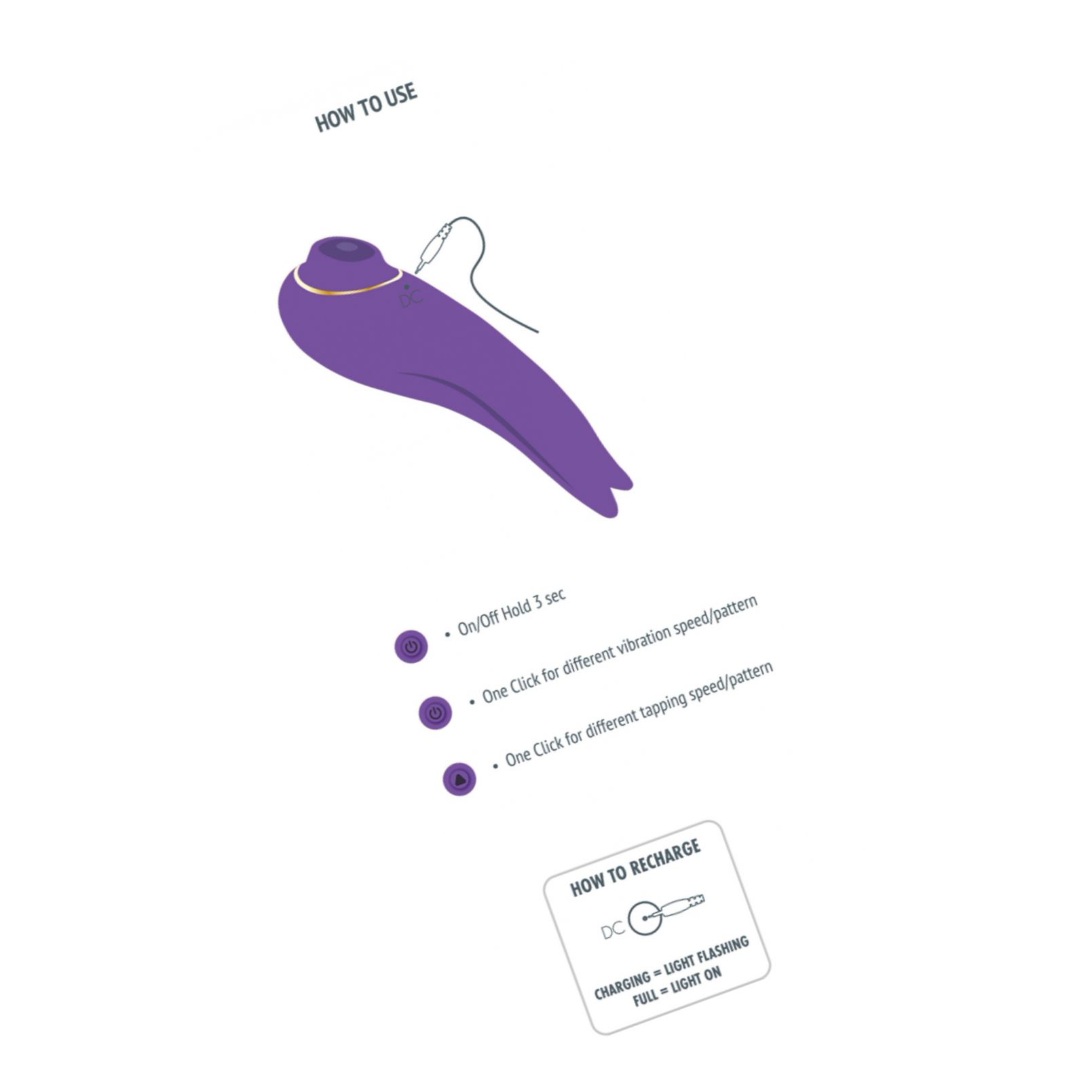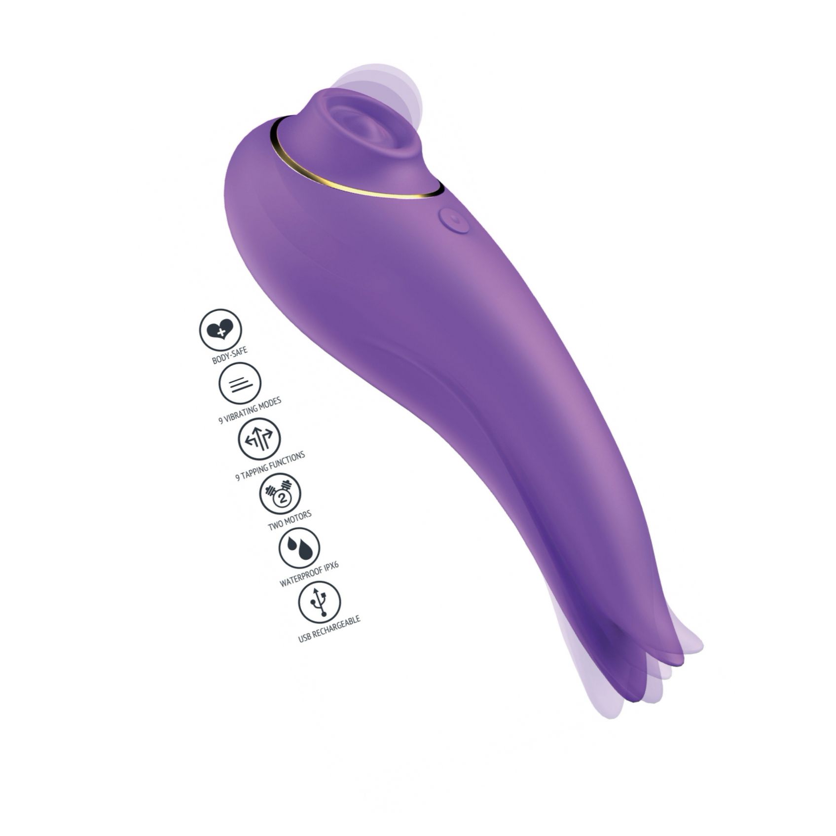 Funcții cheie: - Tehnologie de tapping pentru stârnire țintită a clitorisului - Două motoare pentru vibrații stabile și distribuite - 10 tipuri de vibrații și 3 nivele de viteză - Reîncărcabil cu acumulor Li‑Ion; se încarcă complet în ~120 minute - Până la 60 minute de funcționare cu o încărcare - Durabil la apă, ușor de curățat