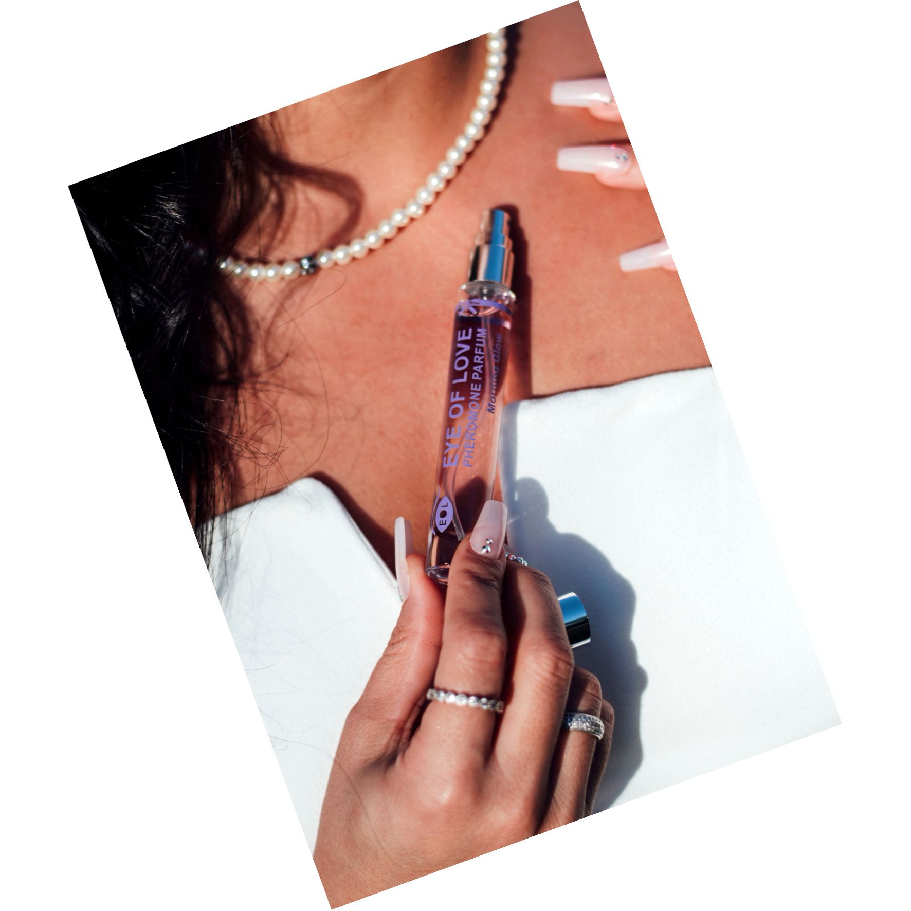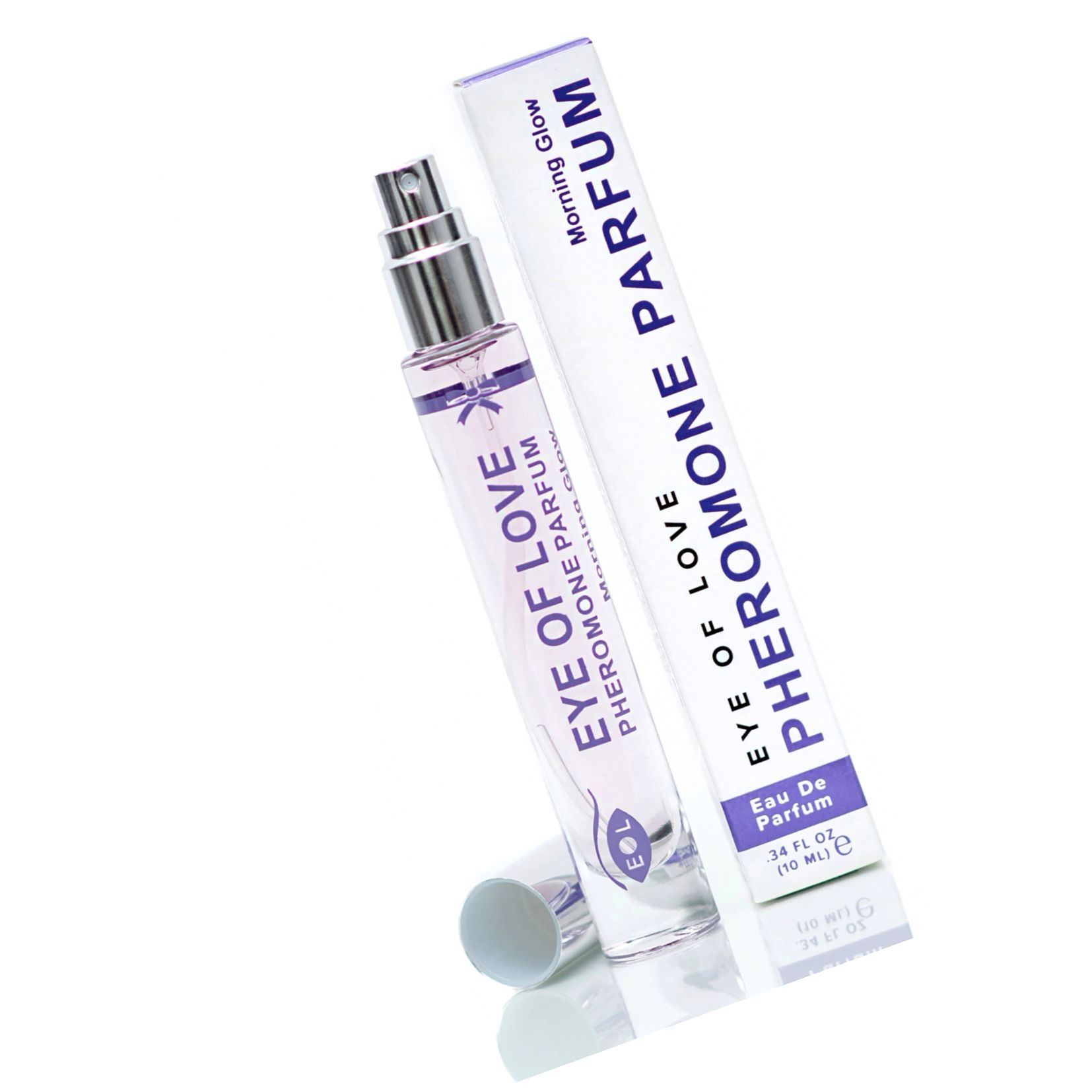 Morning Glow — parfum cu feromoni Eye of Love, 10 ml. Note luminoase de ylang-ylang, lămâie și măr. Flacon din sticlă, combinație blândă cu pielea; compact, discret, ideal pentru întreaga zi.