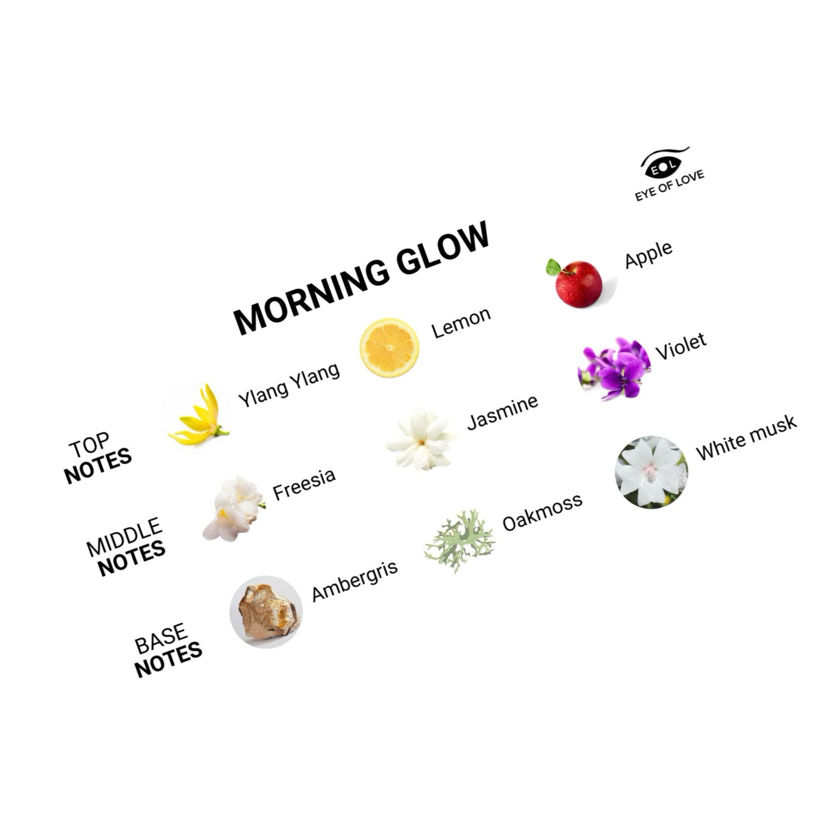Morning Glow este un parfum feminin cu feromoni, realizat pentru a aduce prospețime și rafinament în fiecare dimineață. Notele luminoase de ylang-ylang, lămâie și măr formează un acord echilibrat, desăvârșit pentru purtarea zilnică.